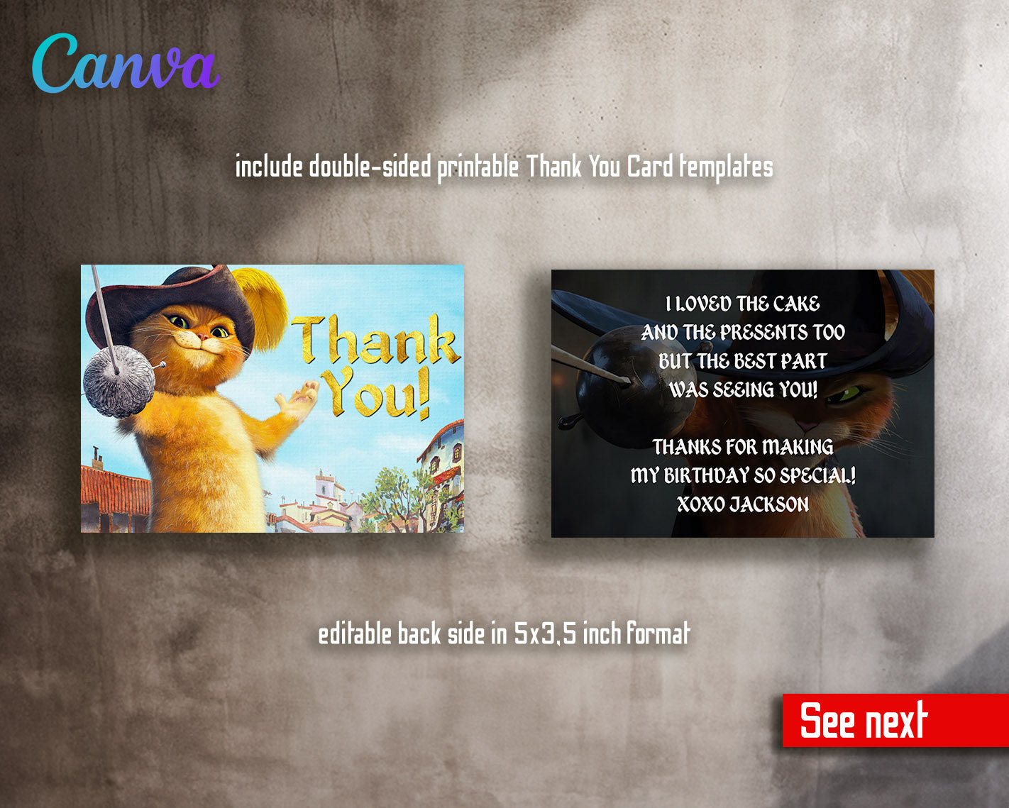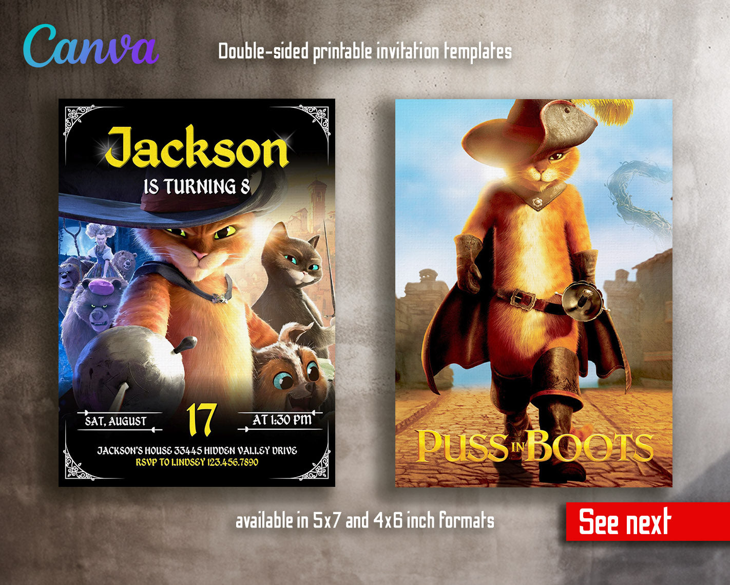 Related Tags: cat invitation, puss boots birthday, puss in boots invite, cat boots invitation, shrek party, digital invite, editable invitation, birthday invitation, printable invitation, invite template, evite, girl birthday,