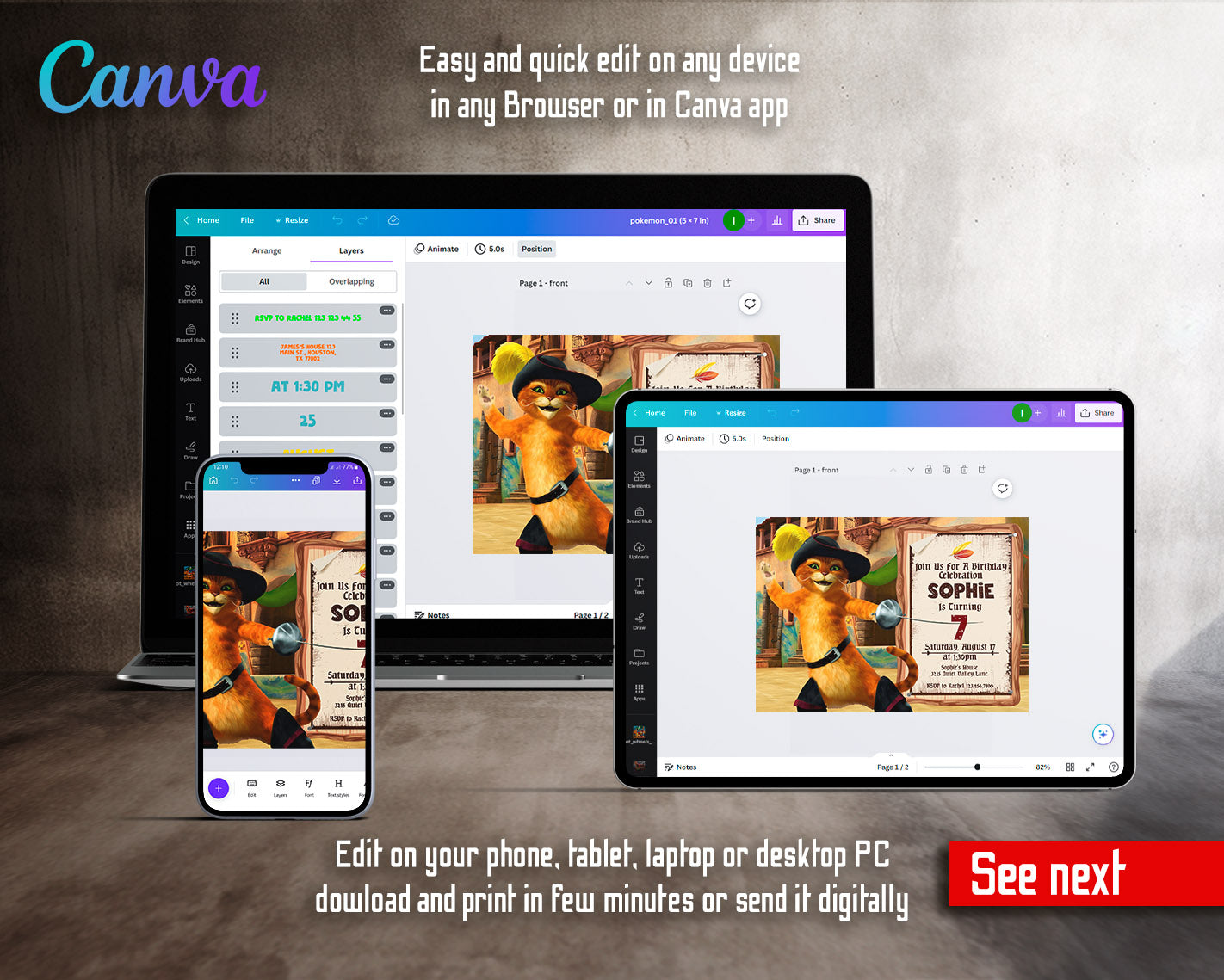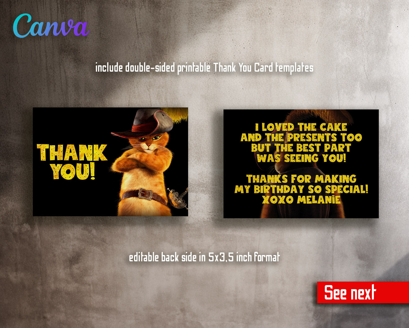 Printable Editable customizable Puss in Boots Cat Shrek birthday party invitation digital template. Instant download invite.