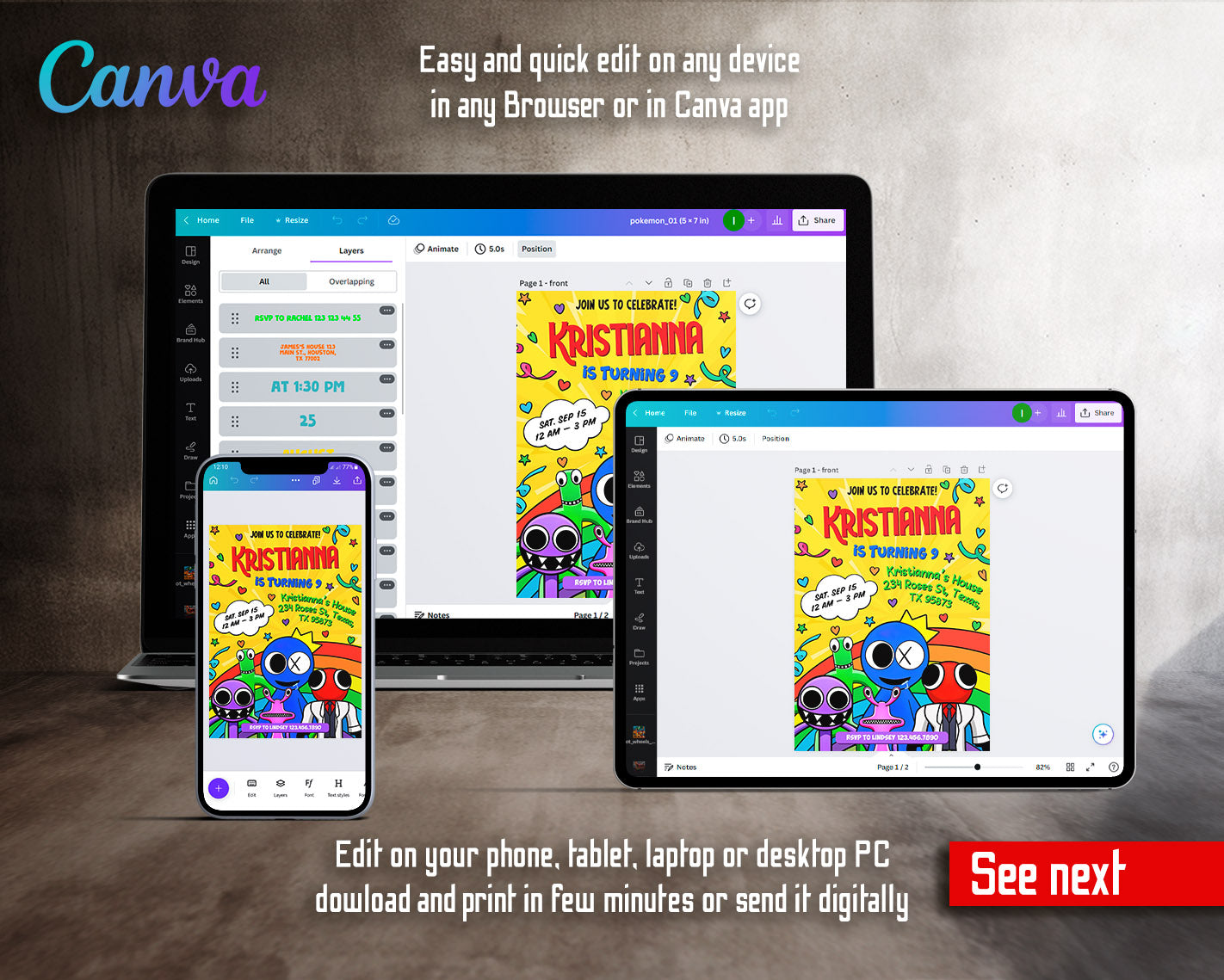 Related Tags: rainbow friends, rainbow birthday, rainbow friend party, rainbow invitation, rainbow gang party, digital invite, editable invitation, birthday invitation, printable invitation, invite template, evite, girl birthday,