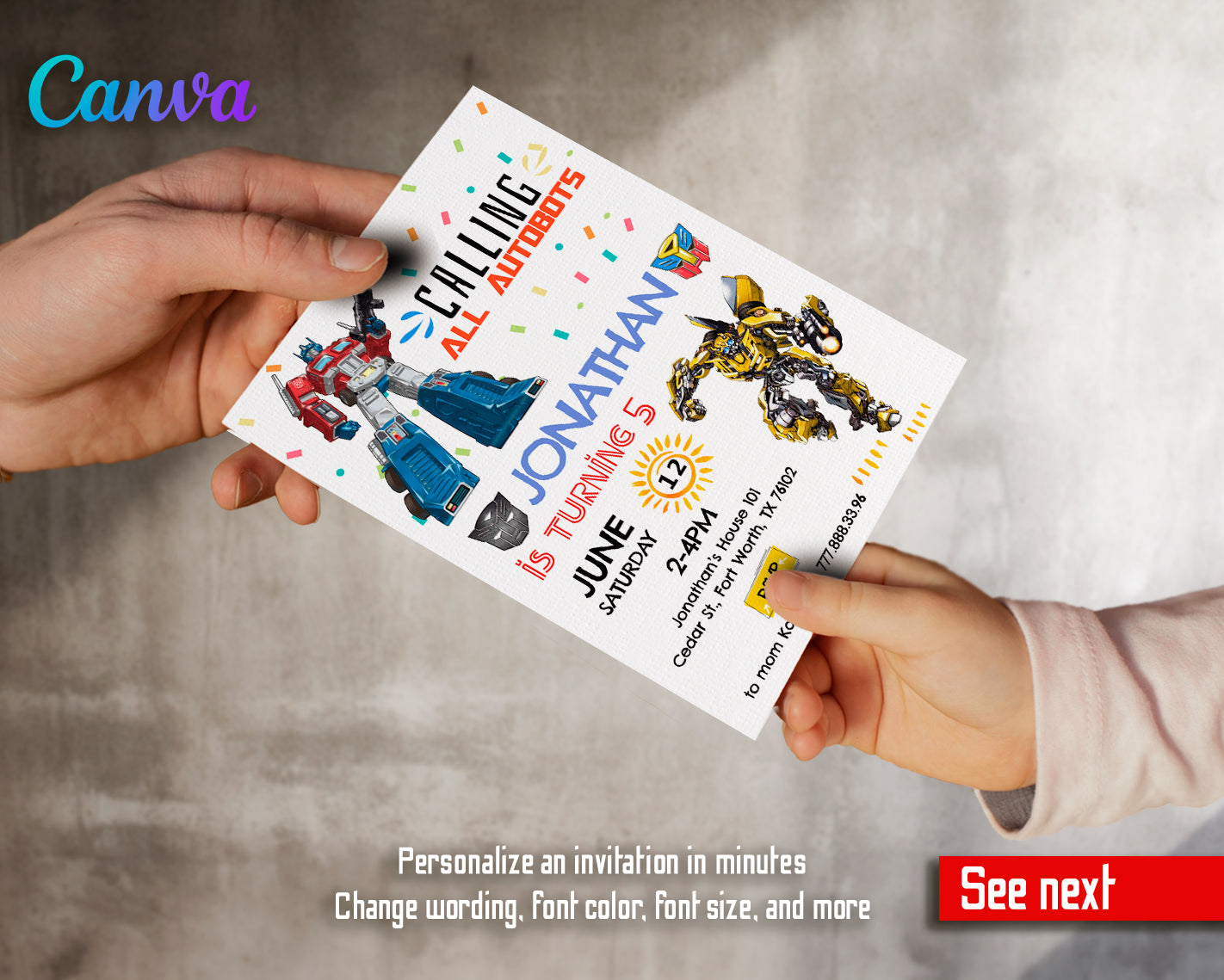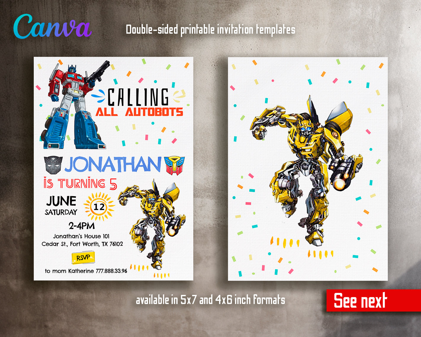 1. Invitation Template to edit in Canva ( 5" x 7" and 4" x 6" sizes), back design included;