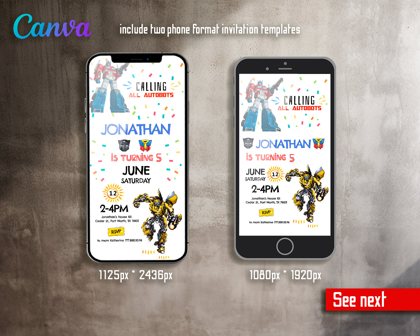 2. Editable Digital Phone Invitation Template: 1080x1920px and 1125x2436px.