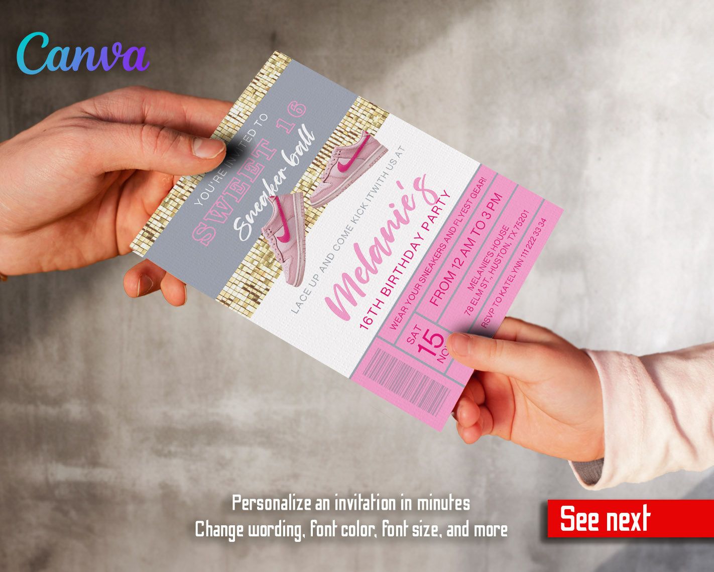 How it works: After the purchase you get a file attached to your order with links to edit your invitation in Canva. You can change the wording and even customize the colors, sizes and fonts of the wording in text blocks. This digital invite can be printed or text messaged.