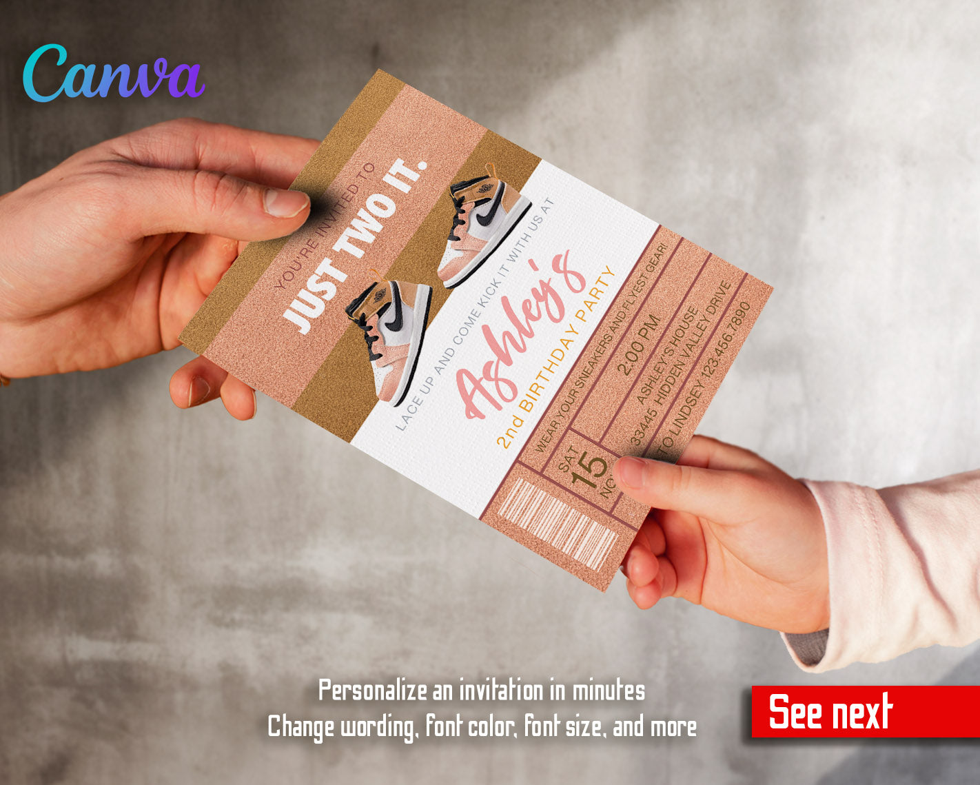 How it works: After the purchase you get a file attached to your order with links to edit your invitation in Canva. You can change the wording and even customize the colors, sizes and fonts of the wording in text blocks. This digital invite can be printed or text messaged.