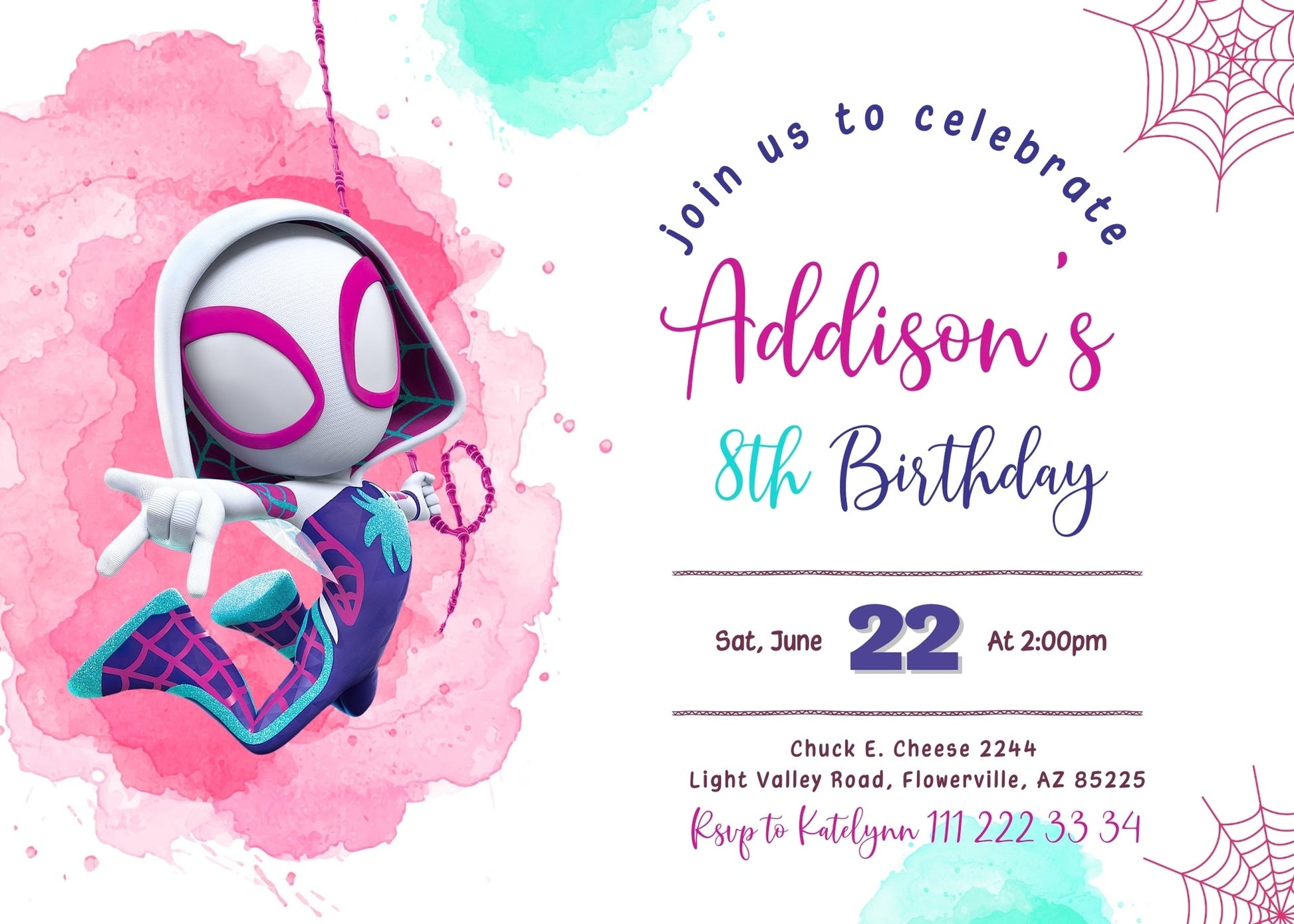 Related Tags: spiderman invitation, spider gwen birthday, spidey gwen invite, ghost spidey invite, spider girl party, amazing friends, superhero invitation, birthday invitation, printable invitation, invite template, spider-verse evite, marvel girl birthday,