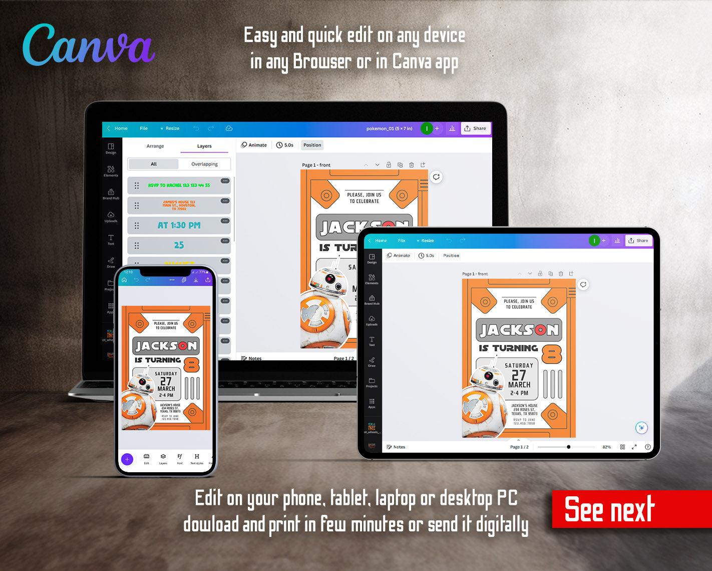 All the invitations are for self-editing. You will edit your template in Canva. It’s easy whether you're using the web browser or the app.