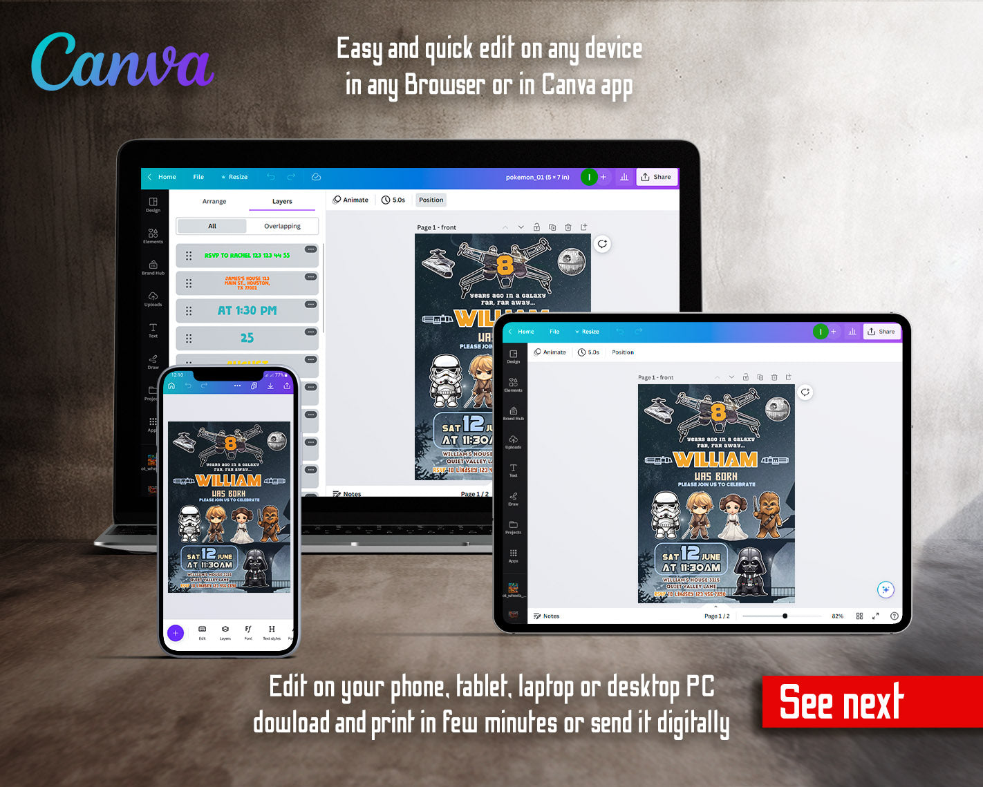 All the invitations are for self-editing. You will edit your template in Canva. It’s easy whether you're using the web browser or the app.
