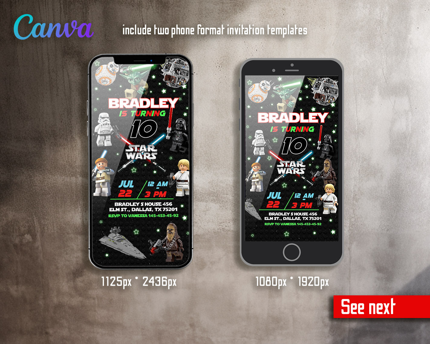 Printable Editable customizable Star Wars Darth Vader Lego Minifigures birthday party invitation digital template. Instant download invite.