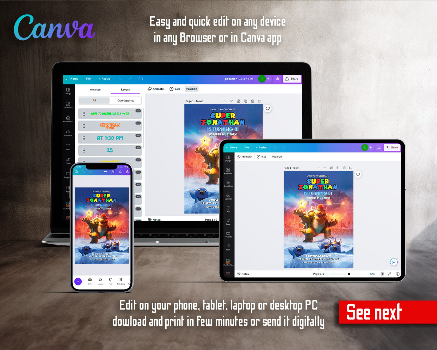 All the invitations are for self-editing. You will edit your template in Canva. It’s easy whether you're using the web browser or the app.