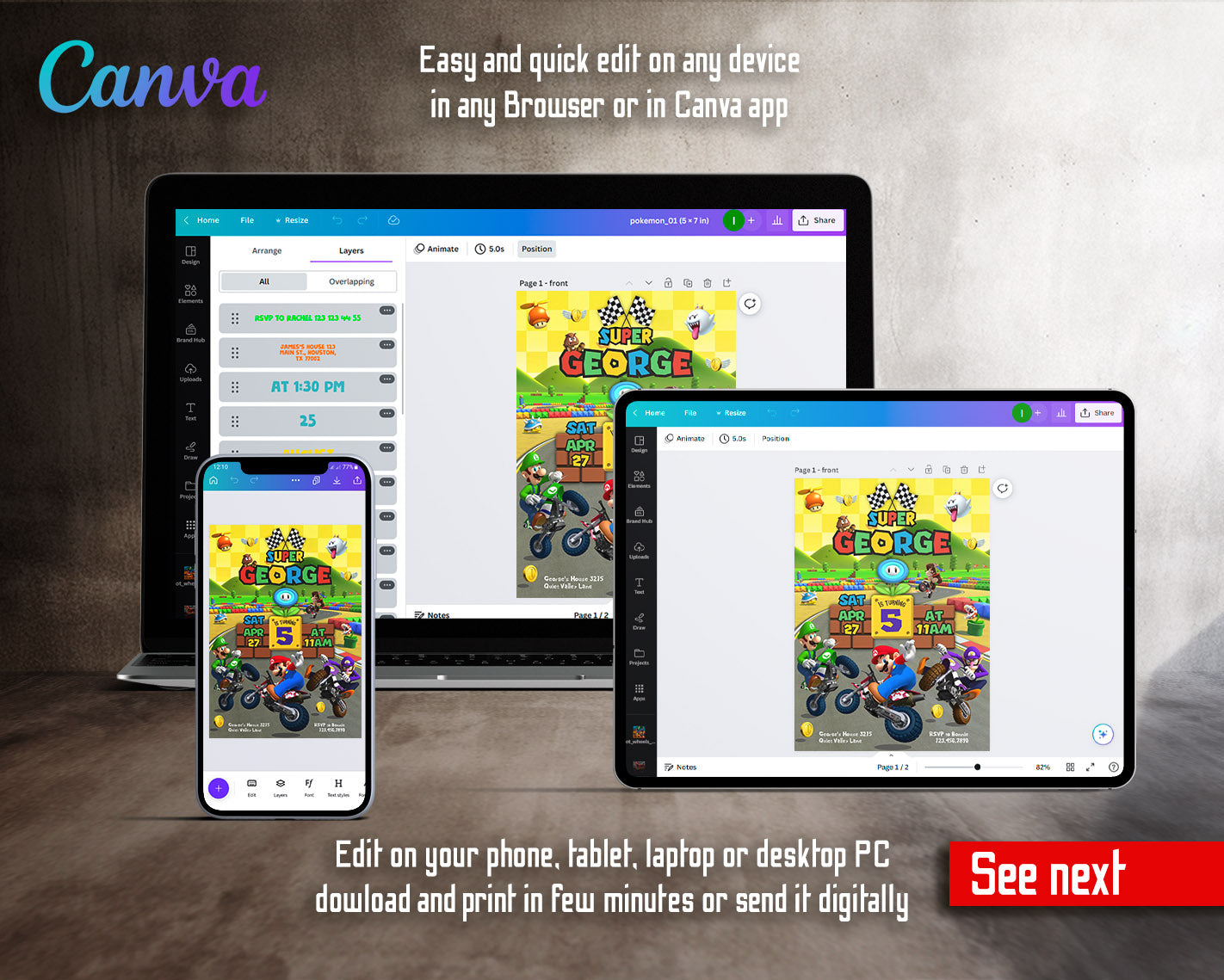 Related Tags: mario invitation, super mario birthday, mario bros invite, mario kart, mario motorcycle, racing invite, editable invitation, birthday invitation, printable invitation, invite template, mario kart invite, girl birthday,