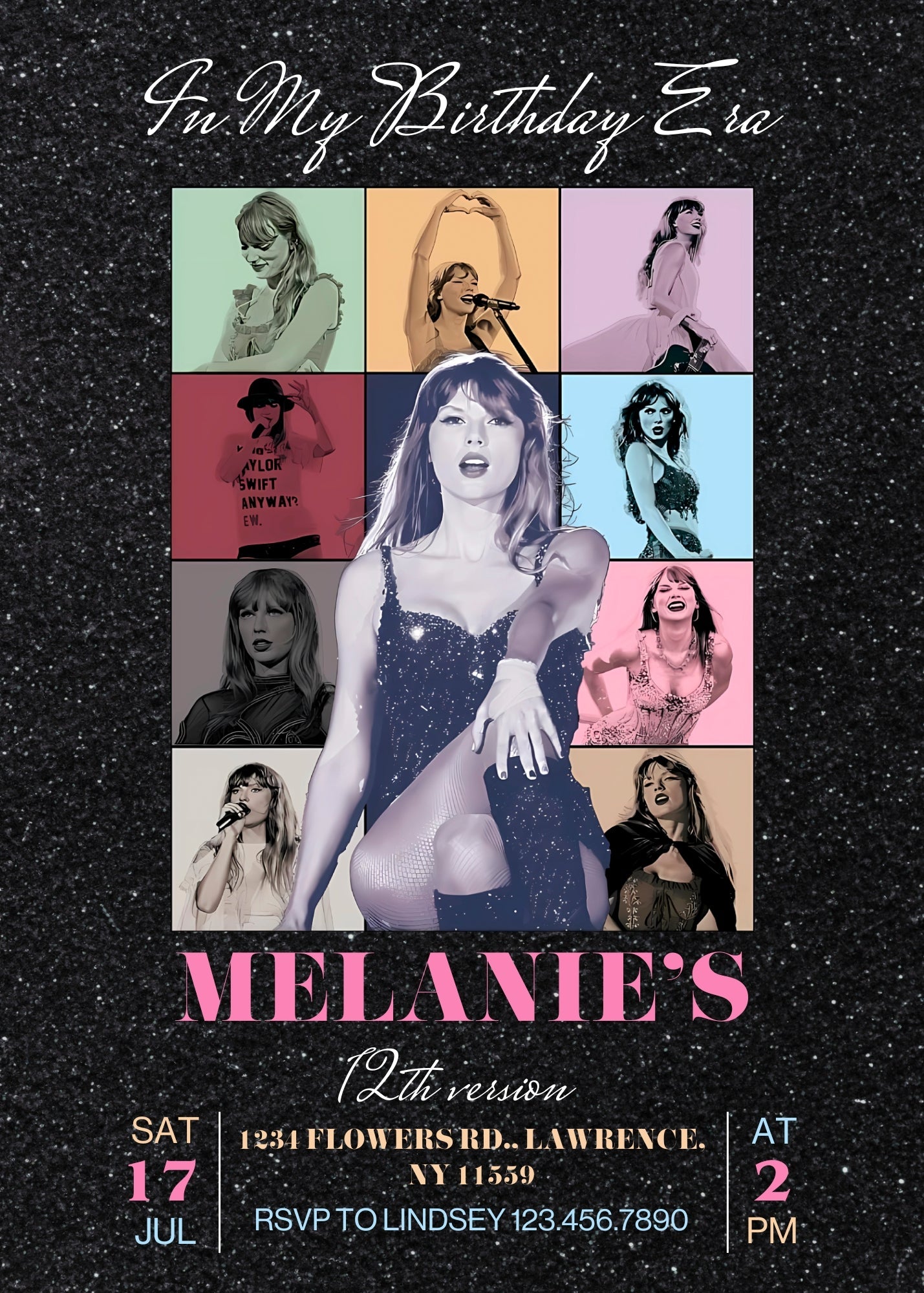 Related Tags: taylor swift invite, taylor swift bday, eras tour invite, musical performance, eras tour party, live ticket invite, editable invitation, birthday invitation, printable invitation, teenager template, my bday era, teen girl birthday, music bday party