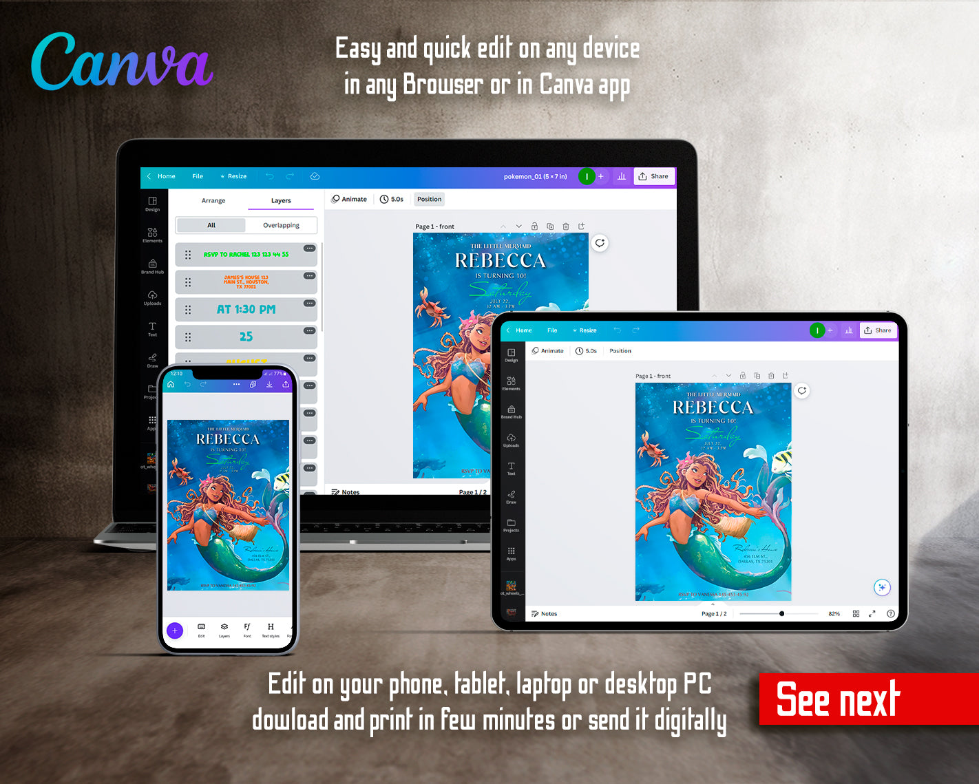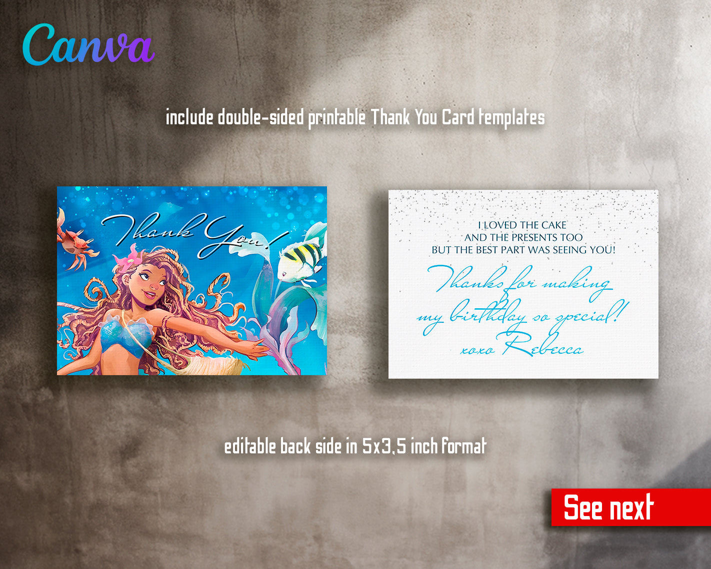 1. Invitation Template to edit in Canva ( 5" x 7" and 4" x 6" sizes), back design included;