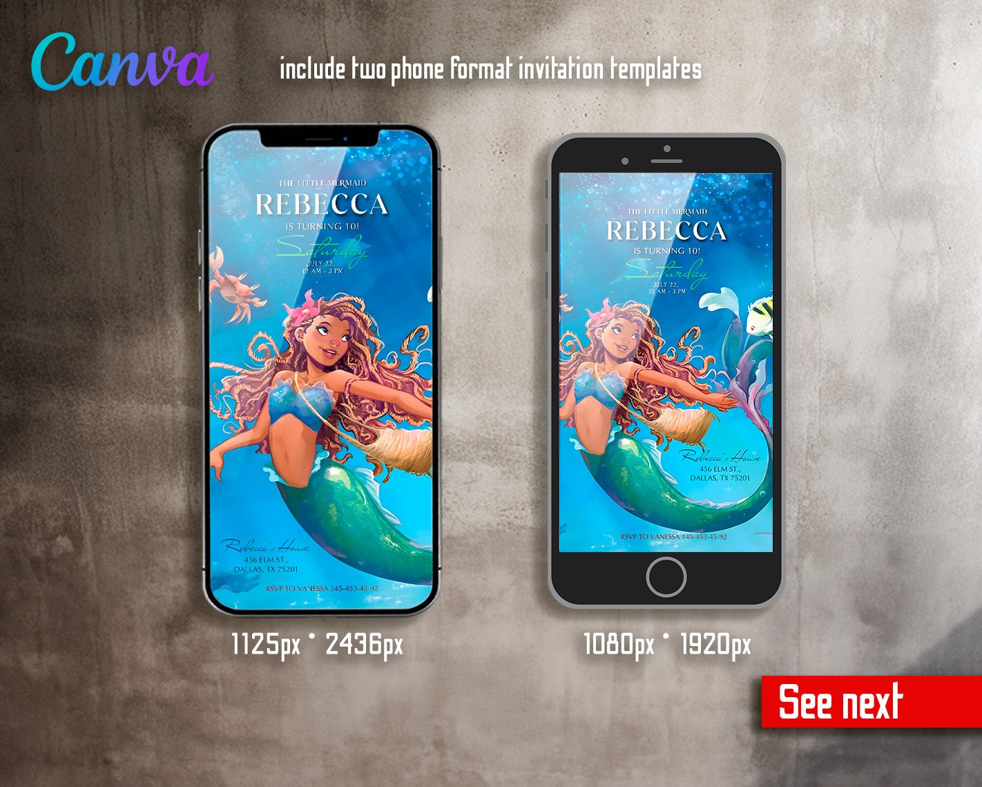 2. Editable Digital Phone Invitation Template: 1080x1920px and 1125x2436px.