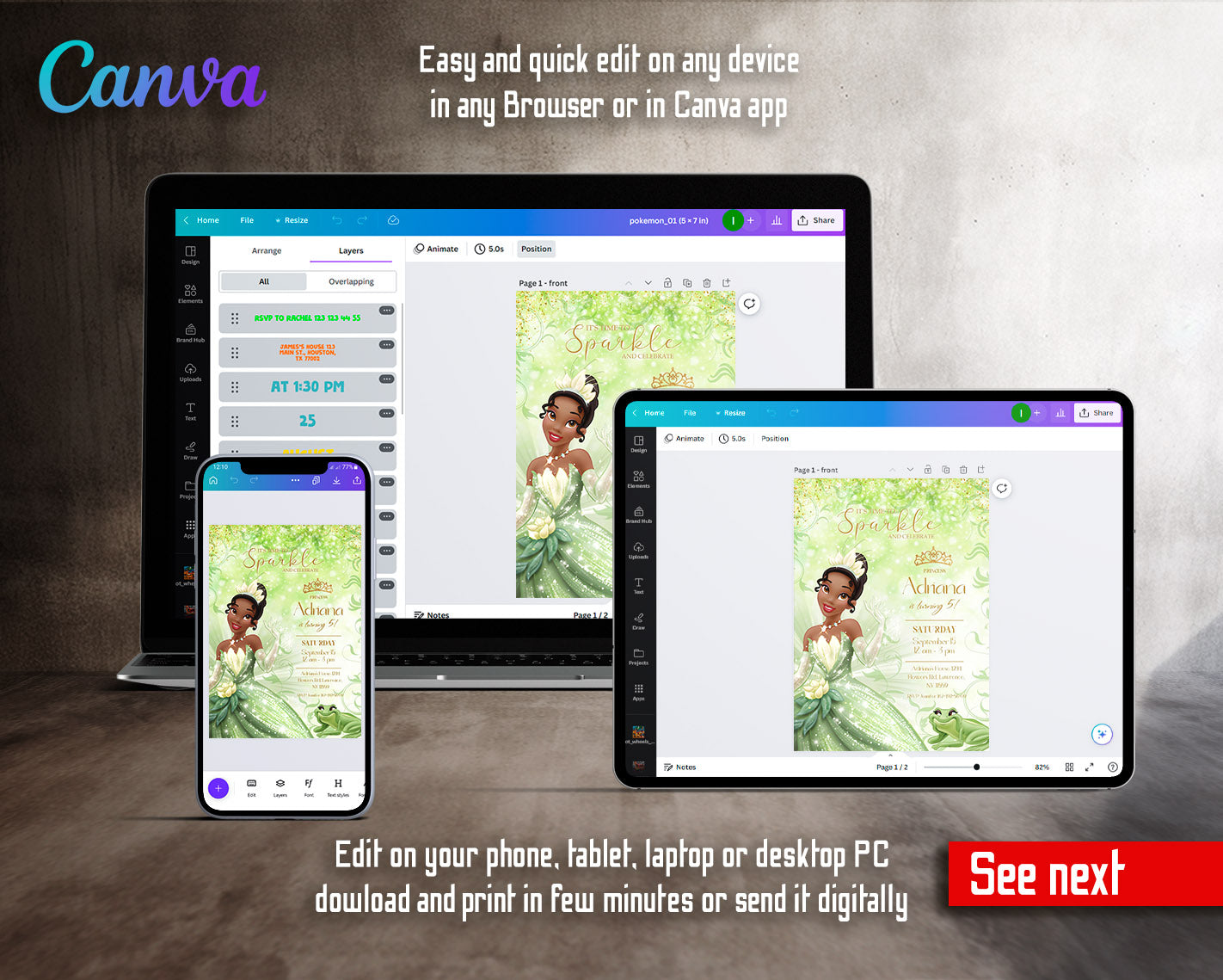 All the invitations are for self-editing. You will edit your template in Canva. It’s easy whether you're using the web browser or the app.