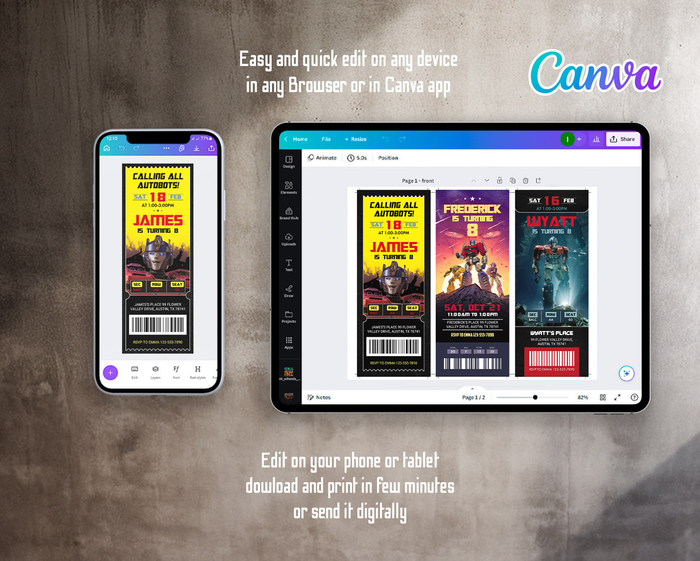 All the invitations are for self-editing. You will edit your template in Canva. It’s easy whether you're using the web browser or the app.