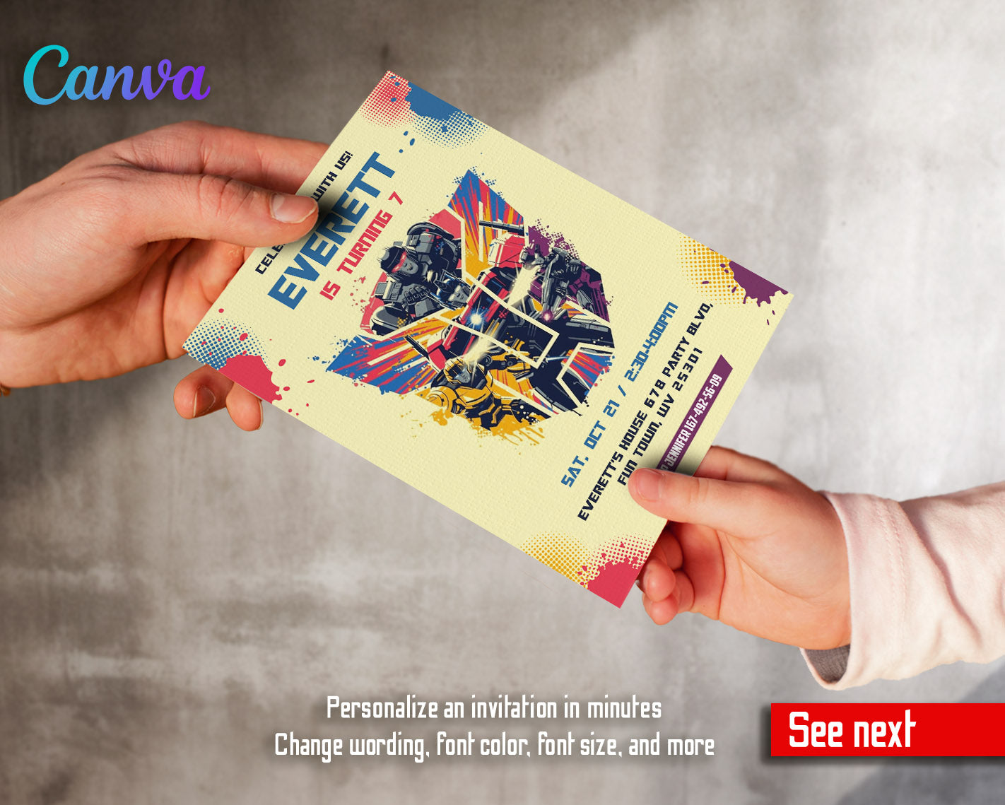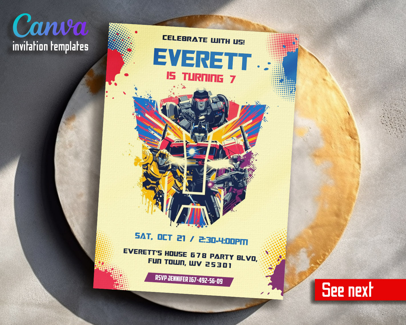 Related Tags: Bumblebee invitation, transforemer invite, Optimus Prime invite, Rescue Bots Invite, rescue bot party, Autobots invitation, editable invitation, birthday invitation, printable invitation, transformers invite, transformers party, rescue bots birthday, boy birthday