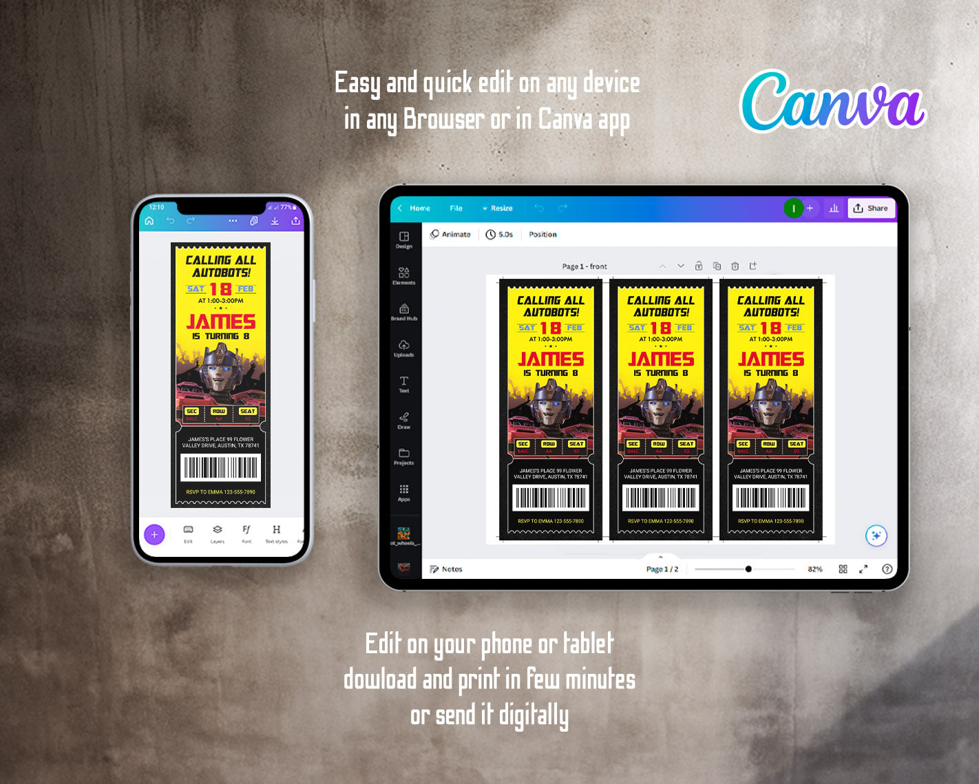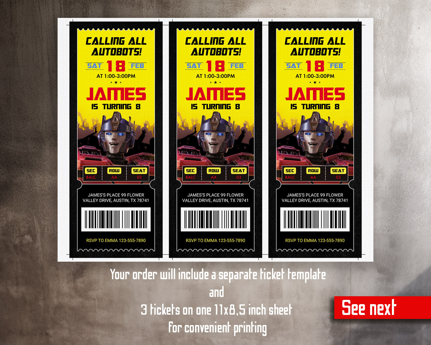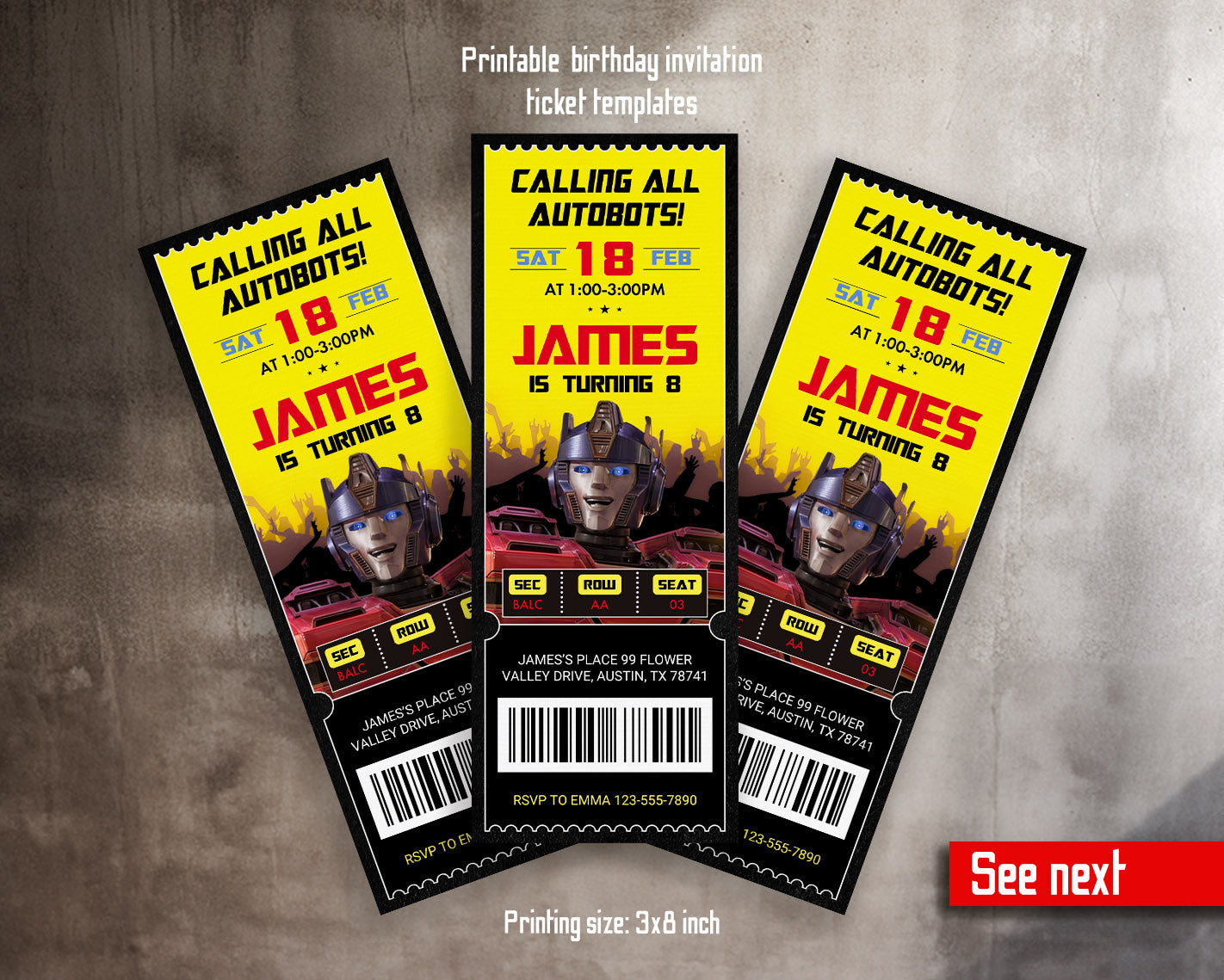Related Tags: Bumblebee invitation, transforemer invite, Optimus Prime invite, Rescue Bots Invite, movie party ticket, Autobots invitation, ticket invitation, birthday invitation, printable invitation, transformers invite, transformers party, rescue bots birthday, boy birthday