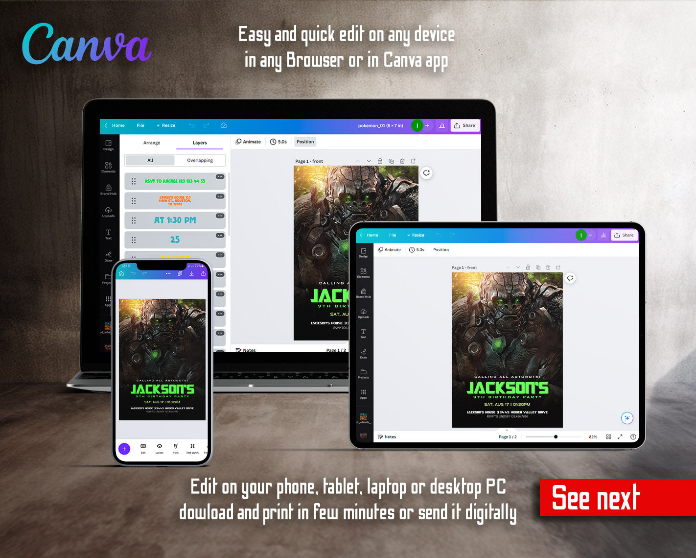 All the invitations are for self-editing. You will edit your template in Canva. It’s easy whether you're using the web browser or the app.