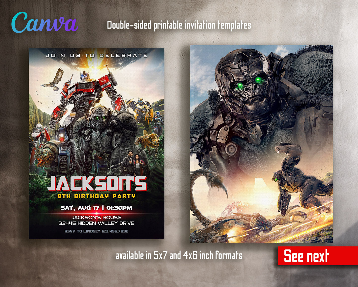 Related Tags: boy birthday, transformers party, rescue bots invite, rescue bots birthday, rise of the beasts, optimus primal, editable invitation, birthday invitation, printable invitation, transformers invite, optimus prime evite, gorilla transformer,
