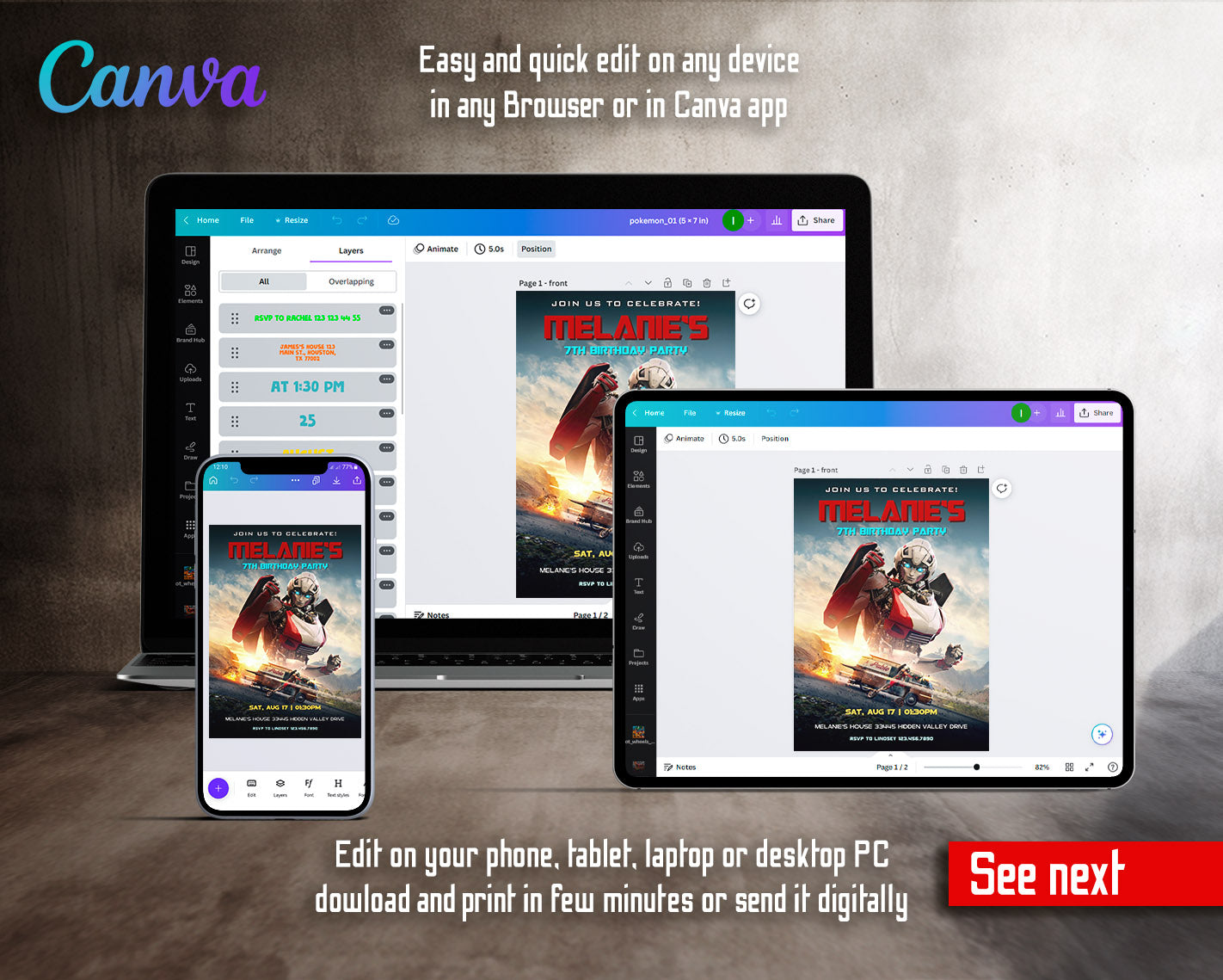 All the invitations are for self-editing. You will edit your template in Canva. It’s easy whether you're using the web browser or the app.