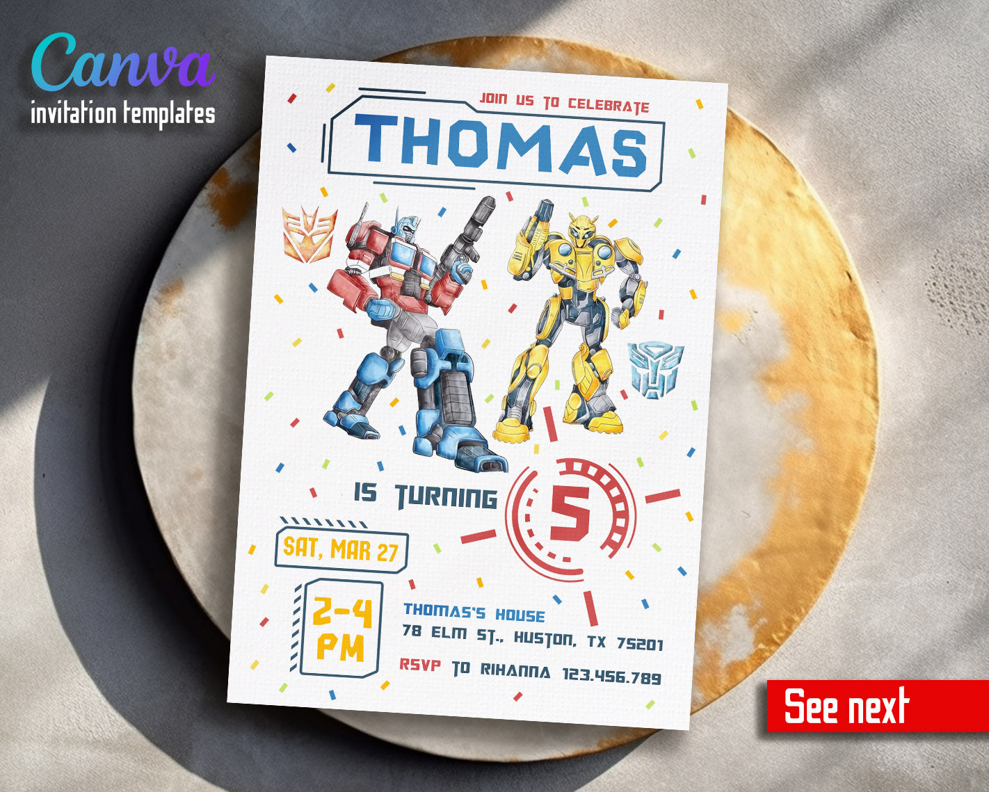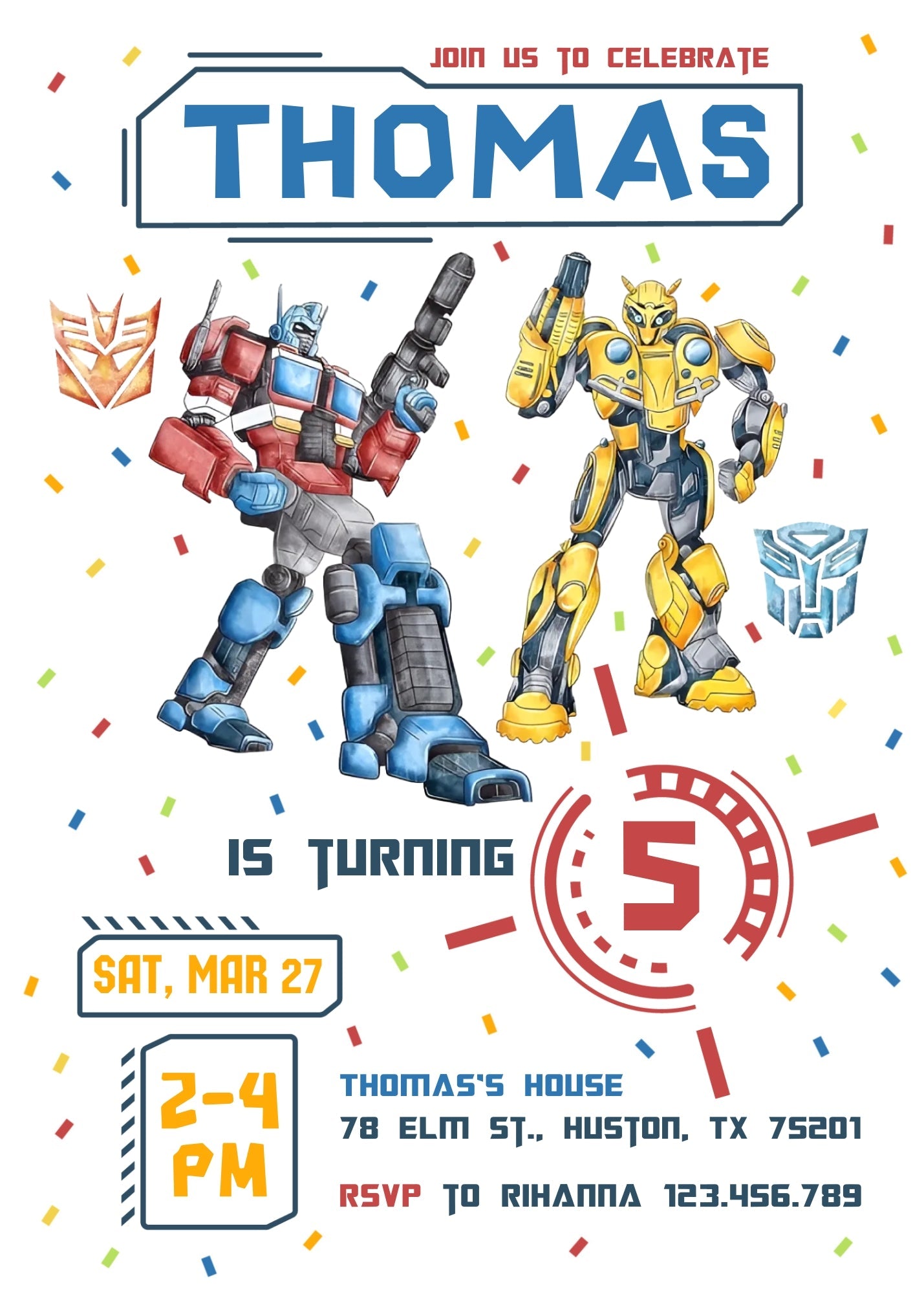 Related Tags: Bumblebee invitation, transforemer invite, Optimus Prime invite, Rescue Bots Invite, rescue bot party, Autobots invitation, editable invitation, birthday invitation, printable invitation, transformers one, transformers party, rescue bots birthday, boy birthday