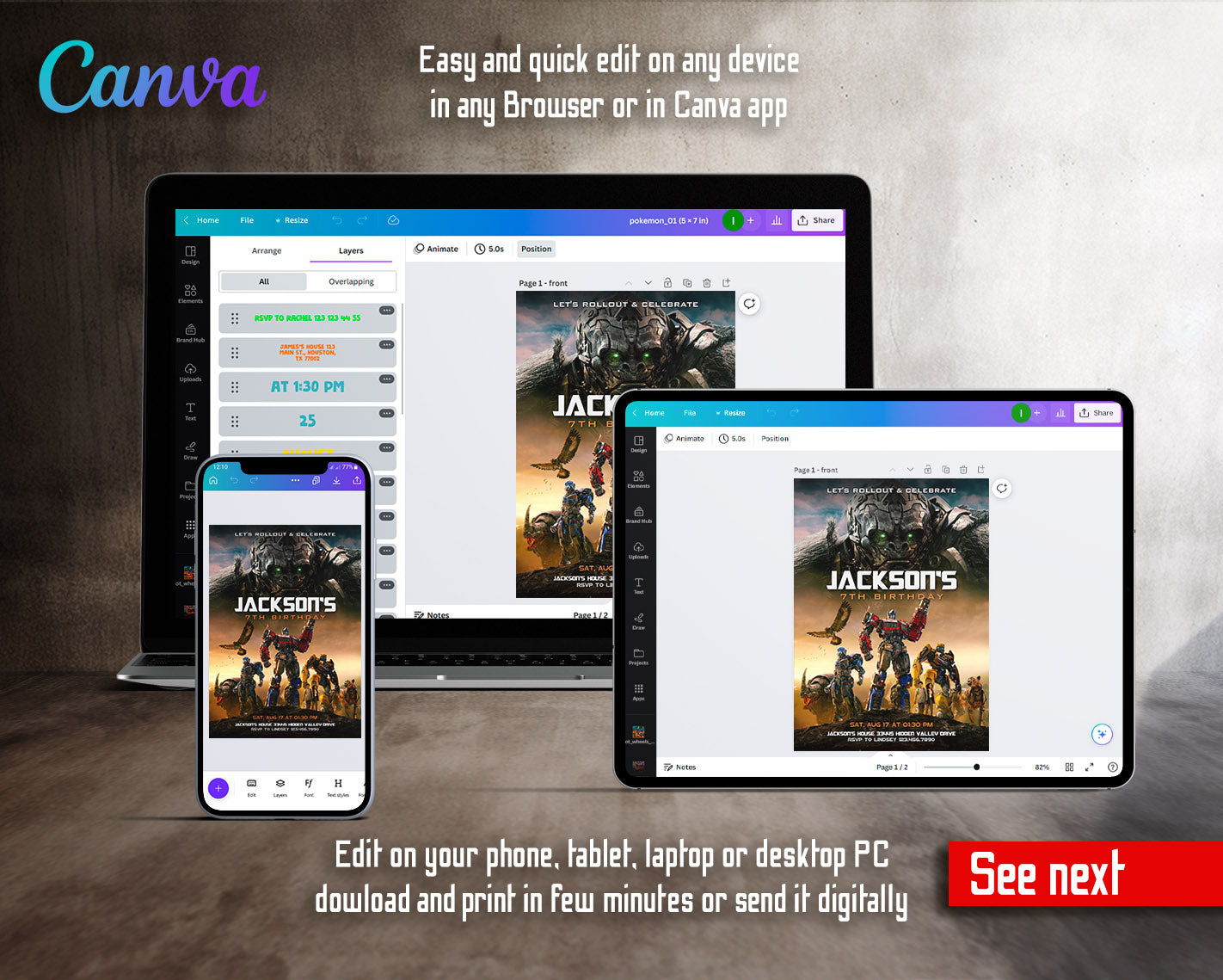All the invitations are for self-editing. You will edit your template in Canva. It’s easy whether you're using the web browser or the app.