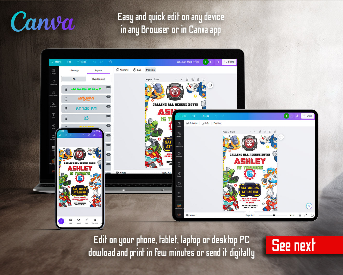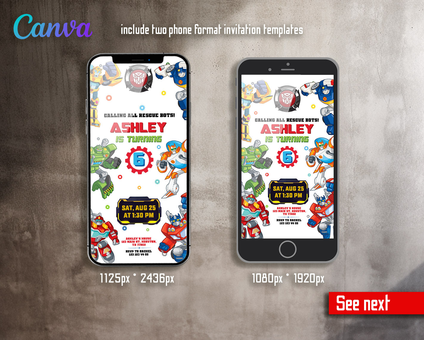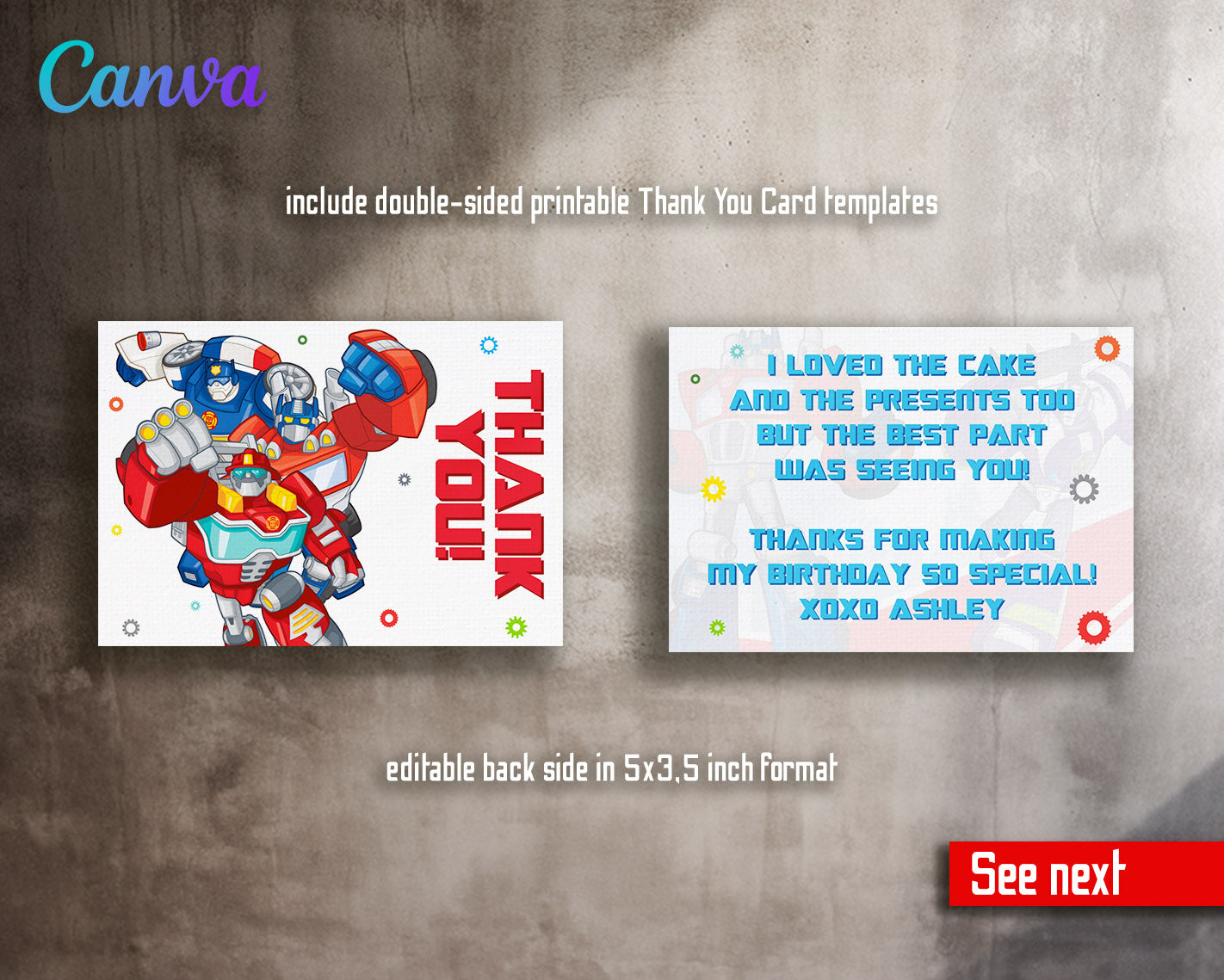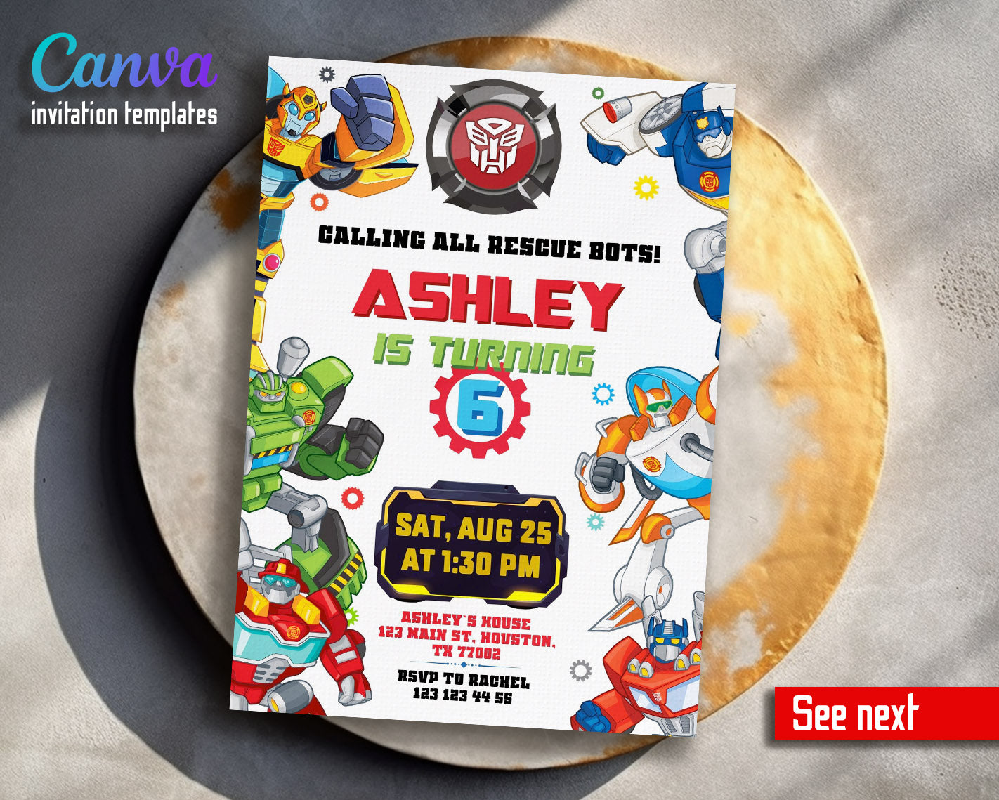 Printable Editable customizable Transformers Rescue Bots birthday party invitation digital template. Instant download invite.