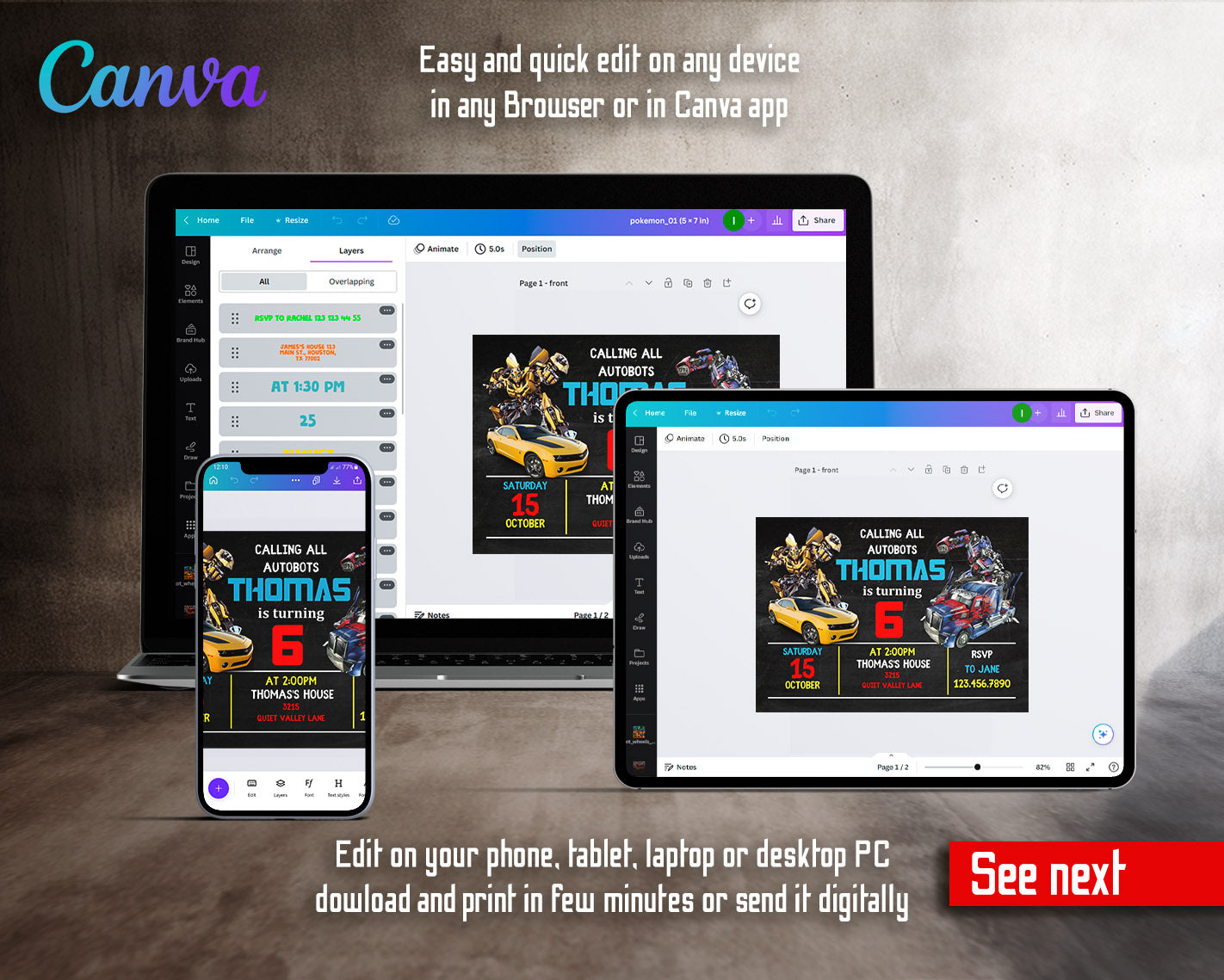 All the invitations are for self-editing. You will edit your template in Canva. It’s easy whether you're using the web browser or the app.