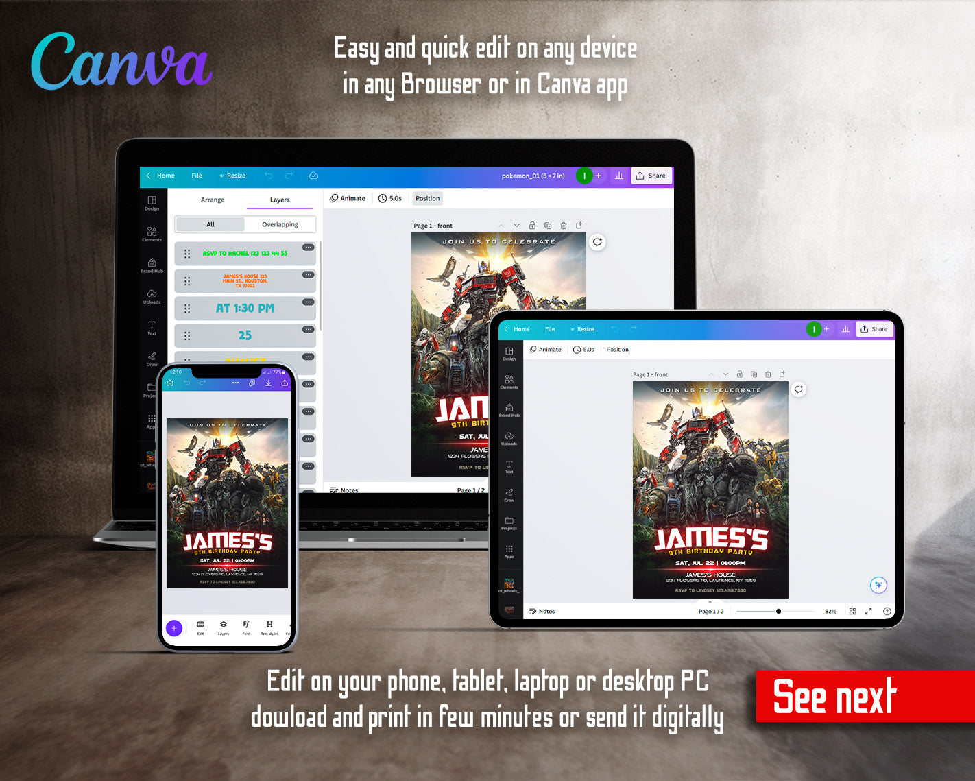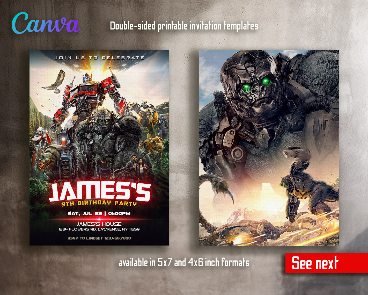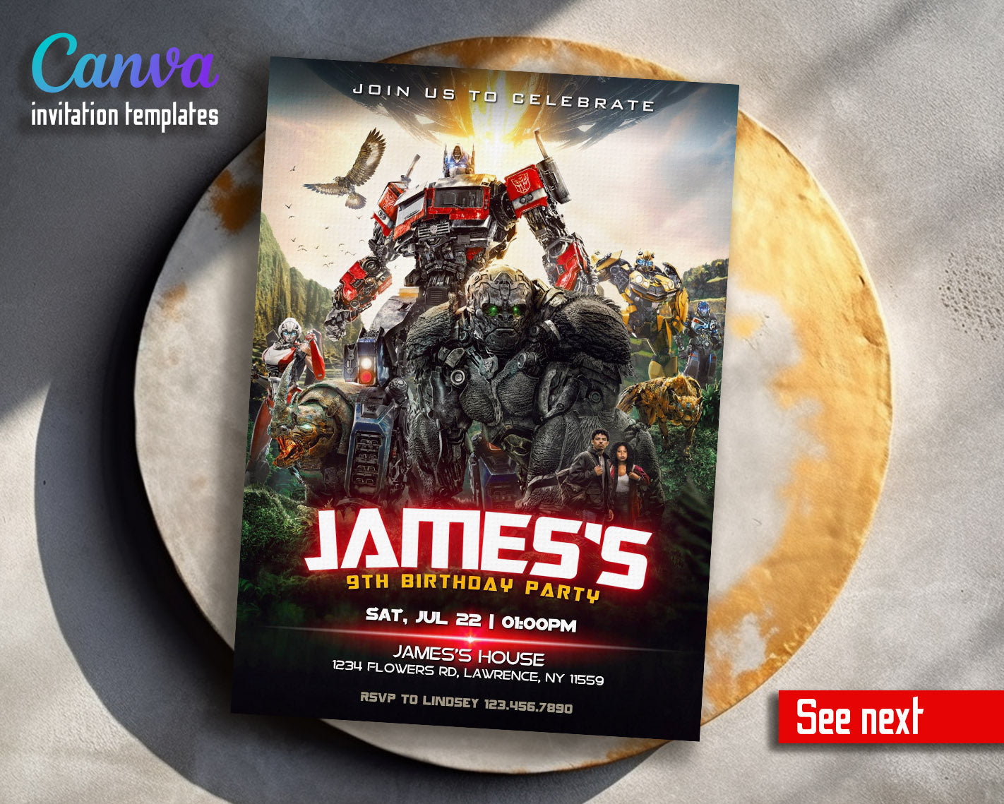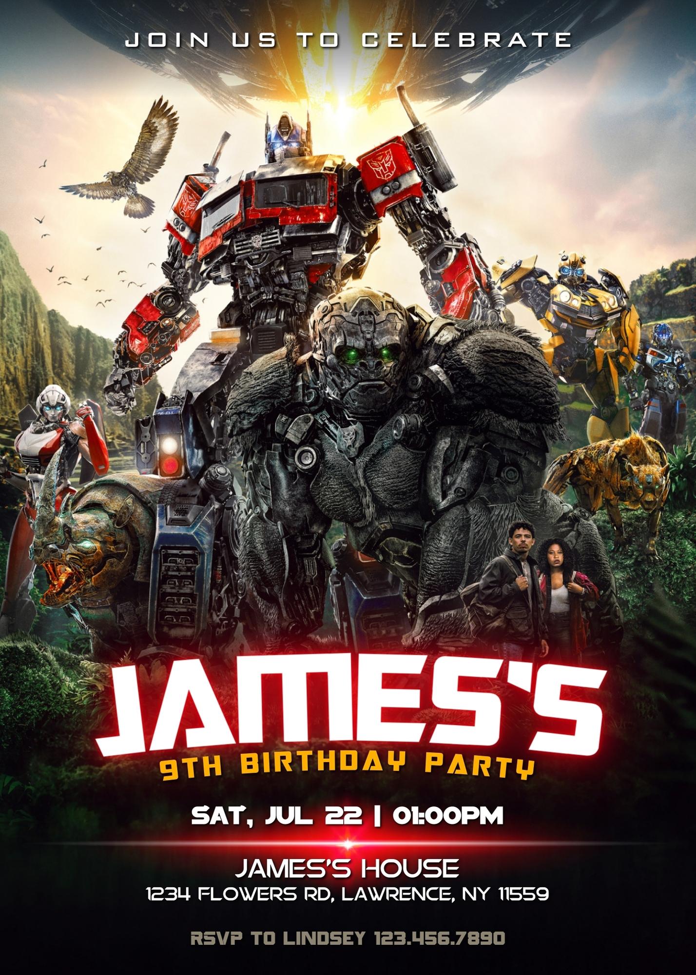 Related Tags: boy birthday, transformers party, rescue bots invite, rescue bots birthday, rise of the beasts, optimus primal, editable invitation, birthday invitation, printable invitation, transformers invite, optimus prime evite, gorilla transformer,