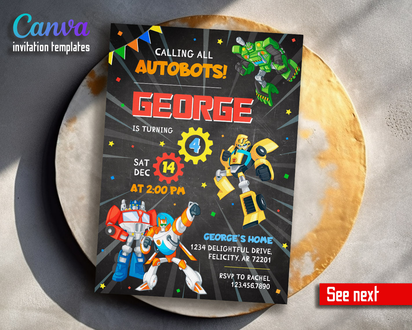 Printable Editable customizable Transformers Rescue Bots birthday party invitation digital template. Instant download invite.