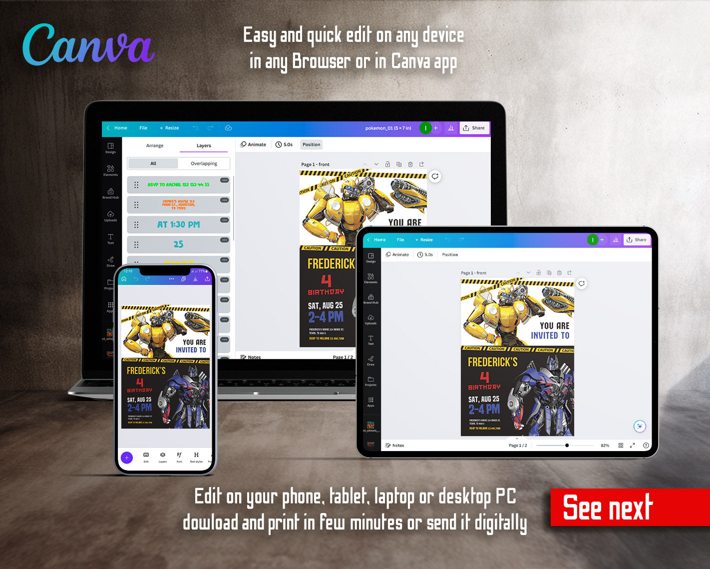 Related Tags: Bumblebee invitation, transforemer invite, Optimus Prime invite, Rescue Bots Invite, rescue bot party, Autobots invitation, editable invitation, birthday invitation, printable invitation, transformers one, transformers party, rescue bots birthday, boy birthday