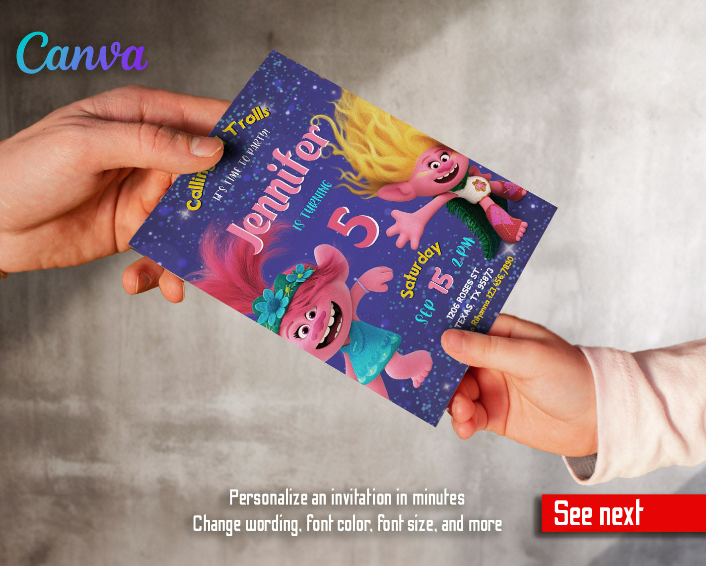 Printable Editable customizable Trolls Poppy birthday party invitation digital template. Instant download invite.