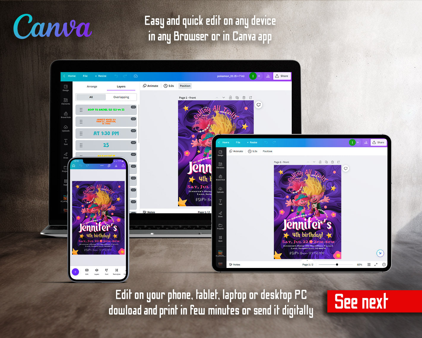 All the invitations are for self-editing. You will edit your template in Canva. It’s easy whether you're using the web browser or the app.