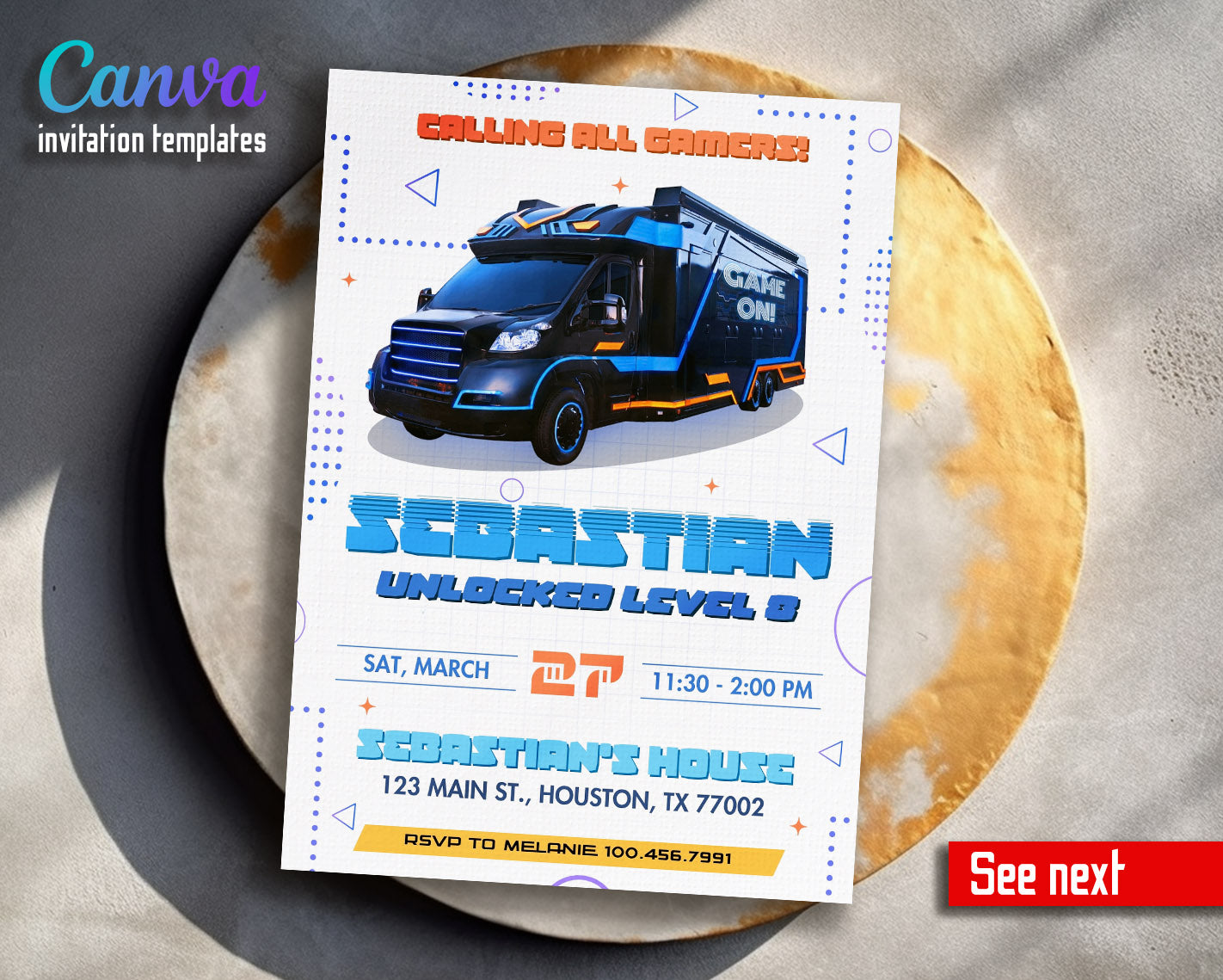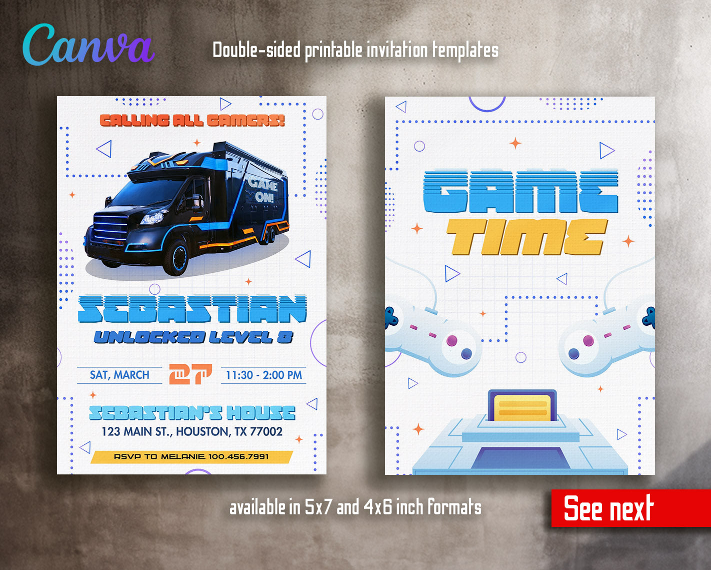 Printable Editable customizable Video Game Bus Gamer birthday party invitation digital template. Instant download invite.