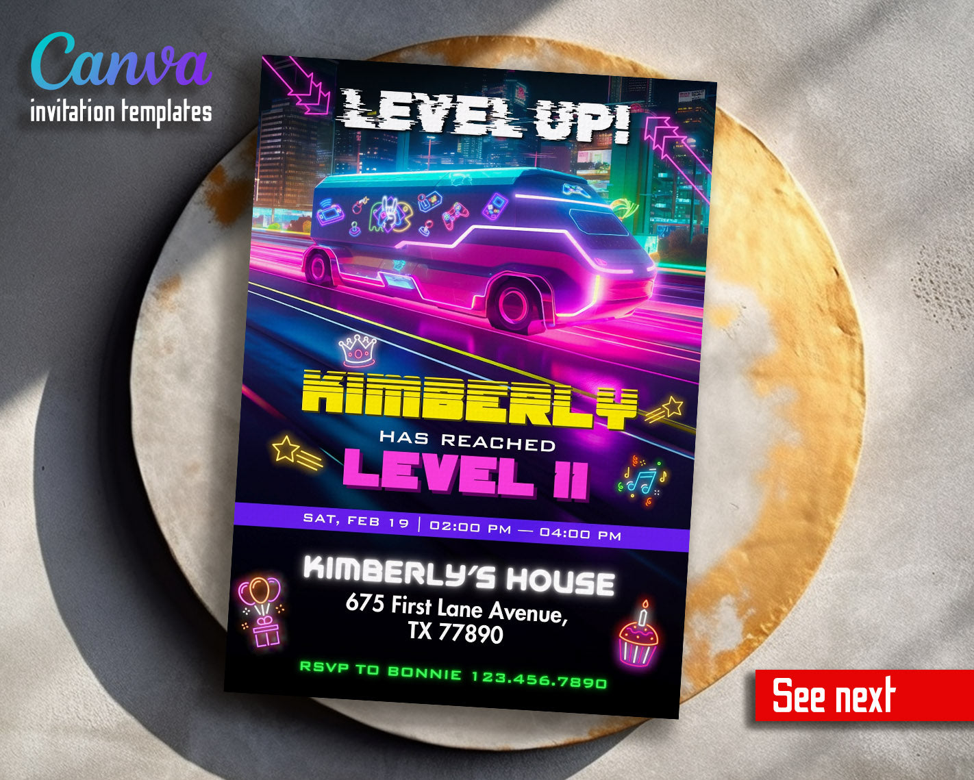 Printable Editable customizable Video Game Bus Gamer birthday party invitation digital template. Instant download invite.