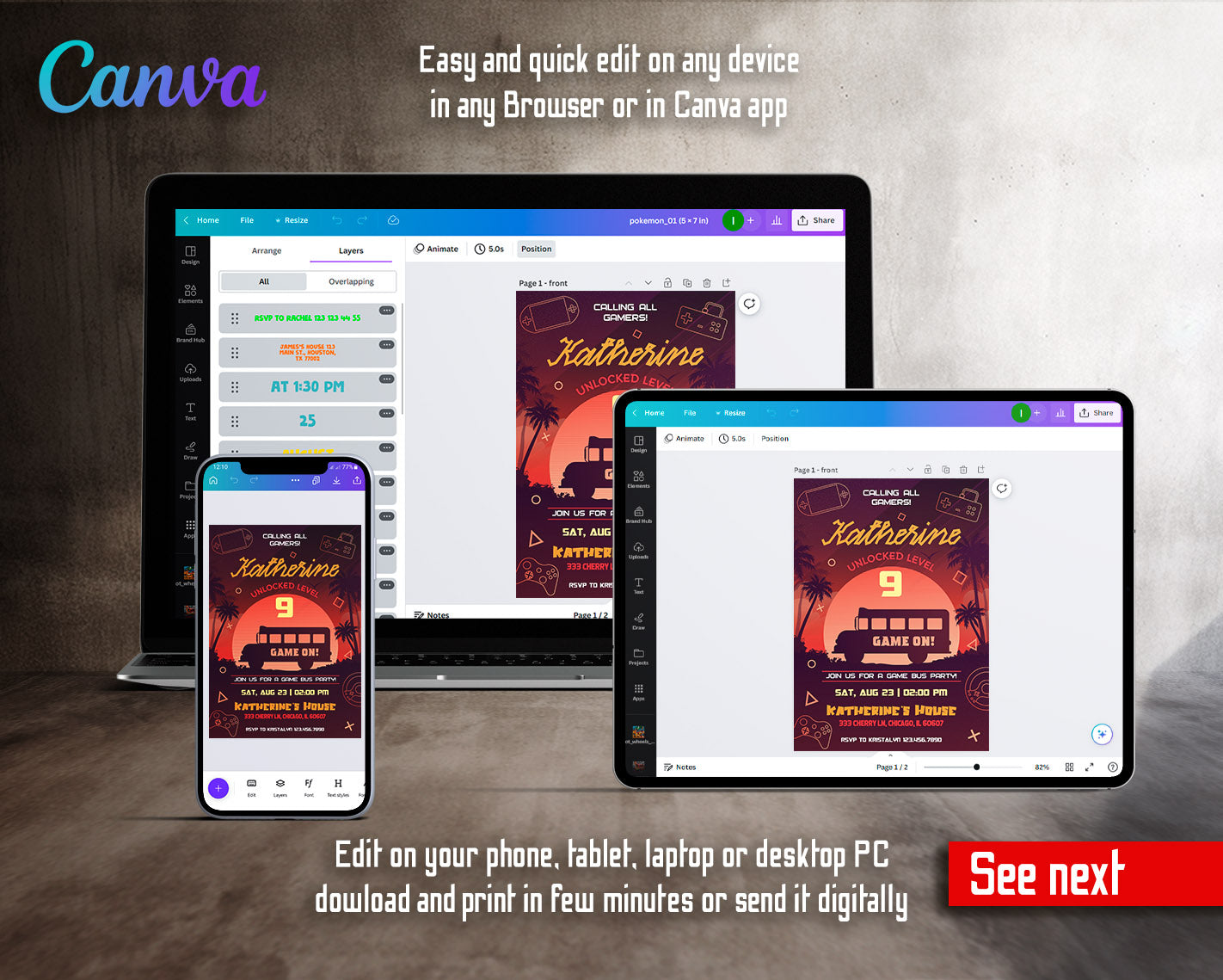 All the invitations are for self-editing. You will edit your template in Canva. It’s easy whether you're using the web browser or the app.