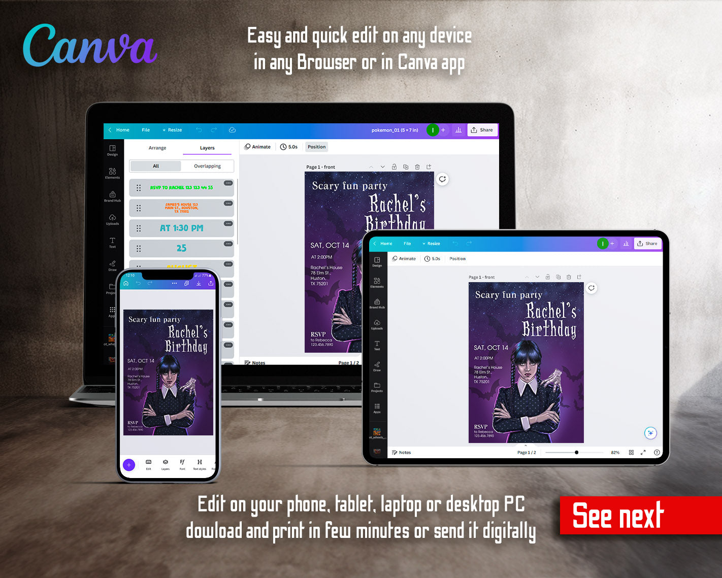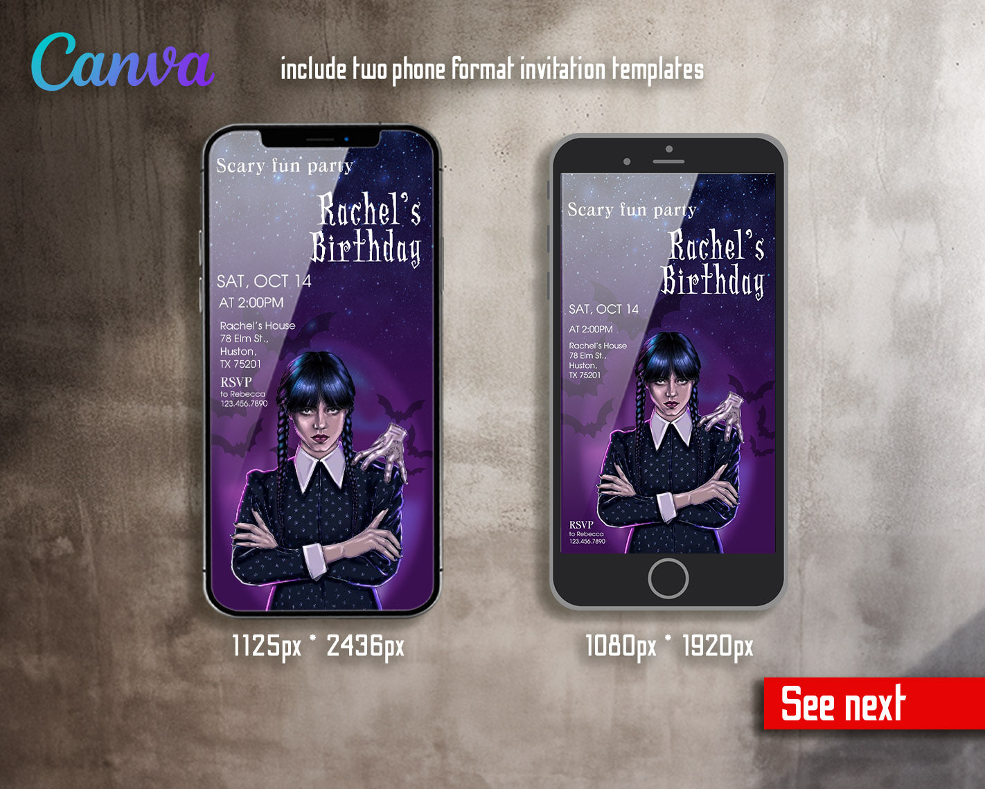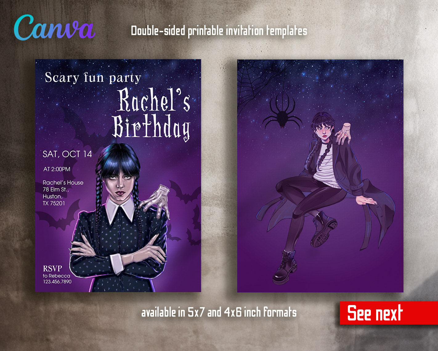 Related Tags: wednesday invite, wednesday birthday, addams family invite, addans invitation, wednesday party, digital invite, editable invitation, birthday invitation, printable invitation, invite template, scary witch, girl birthday,