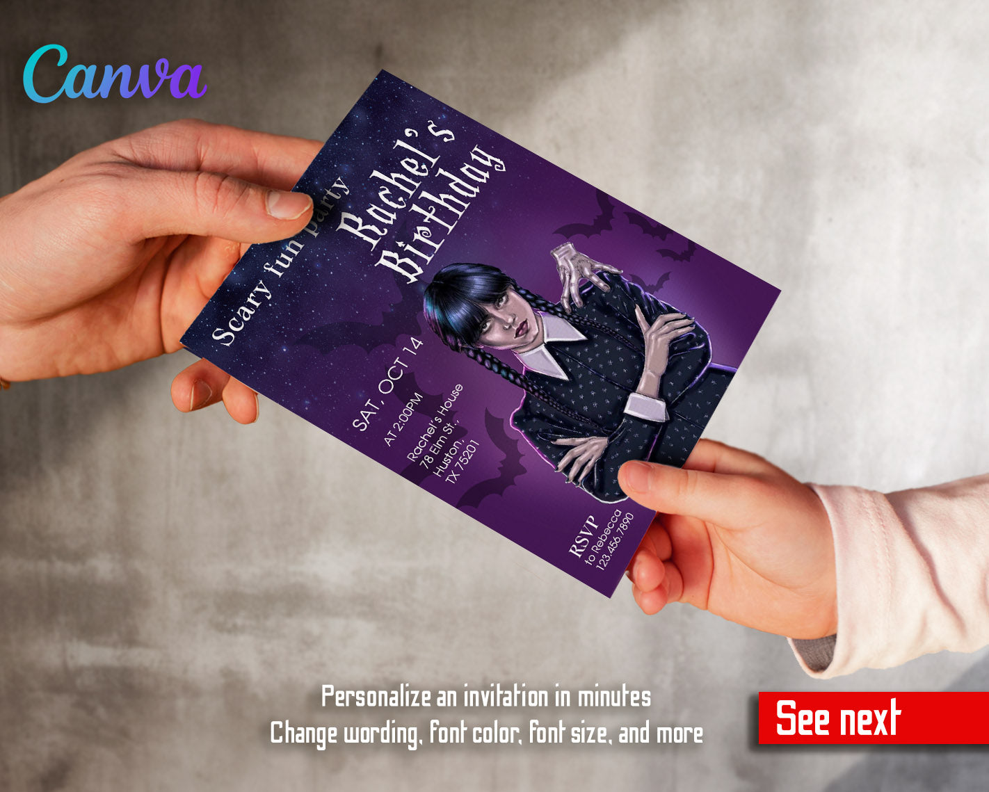 Printable Editable customizable Wednesday Addams birthday party invitation digital template. Instant download invite.