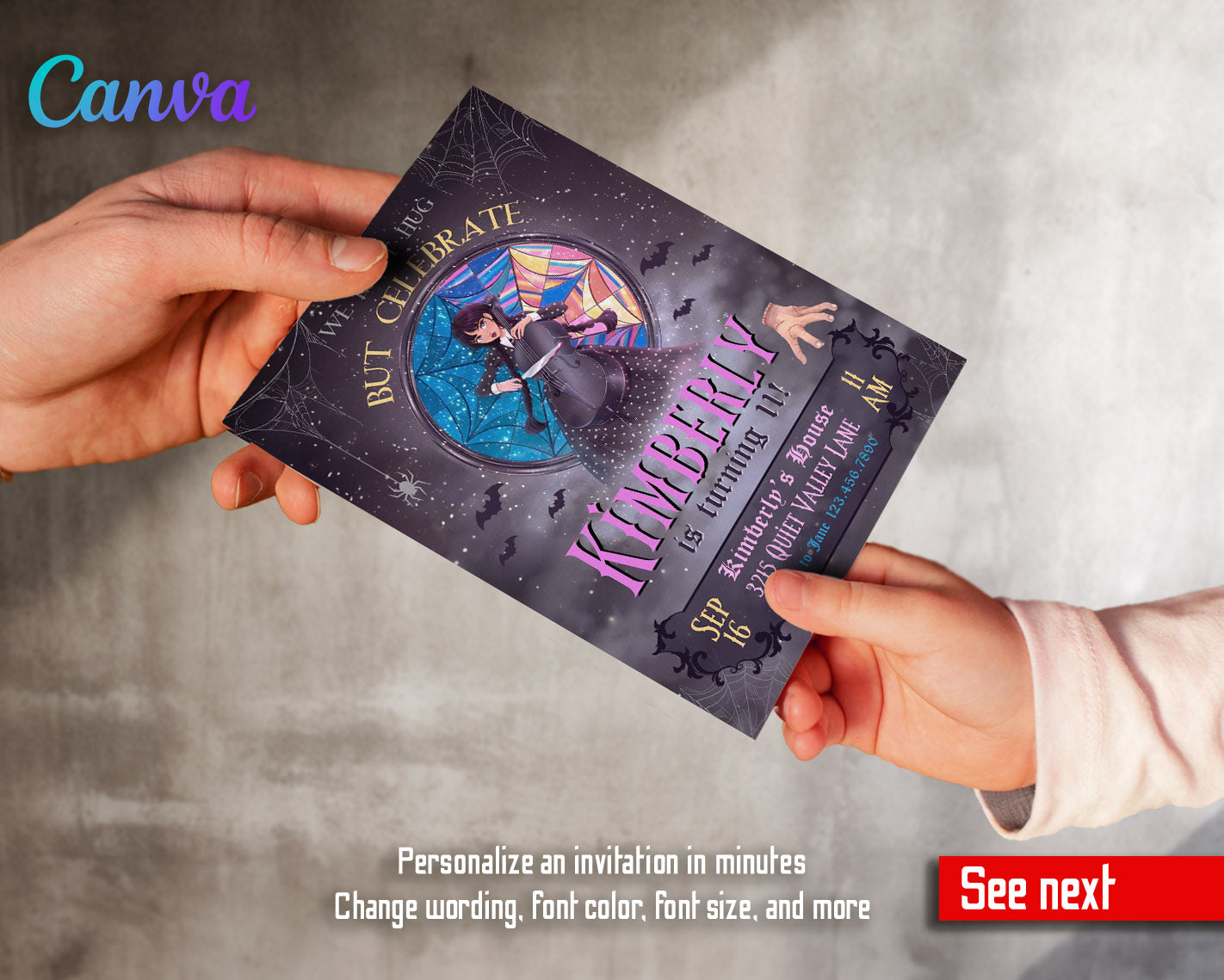 Printable Editable customizable Wednesday Addams birthday party invitation digital template. Instant download invite.