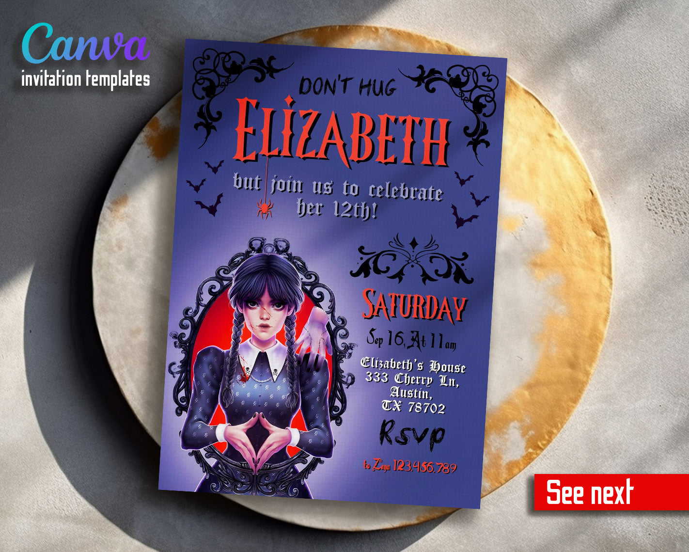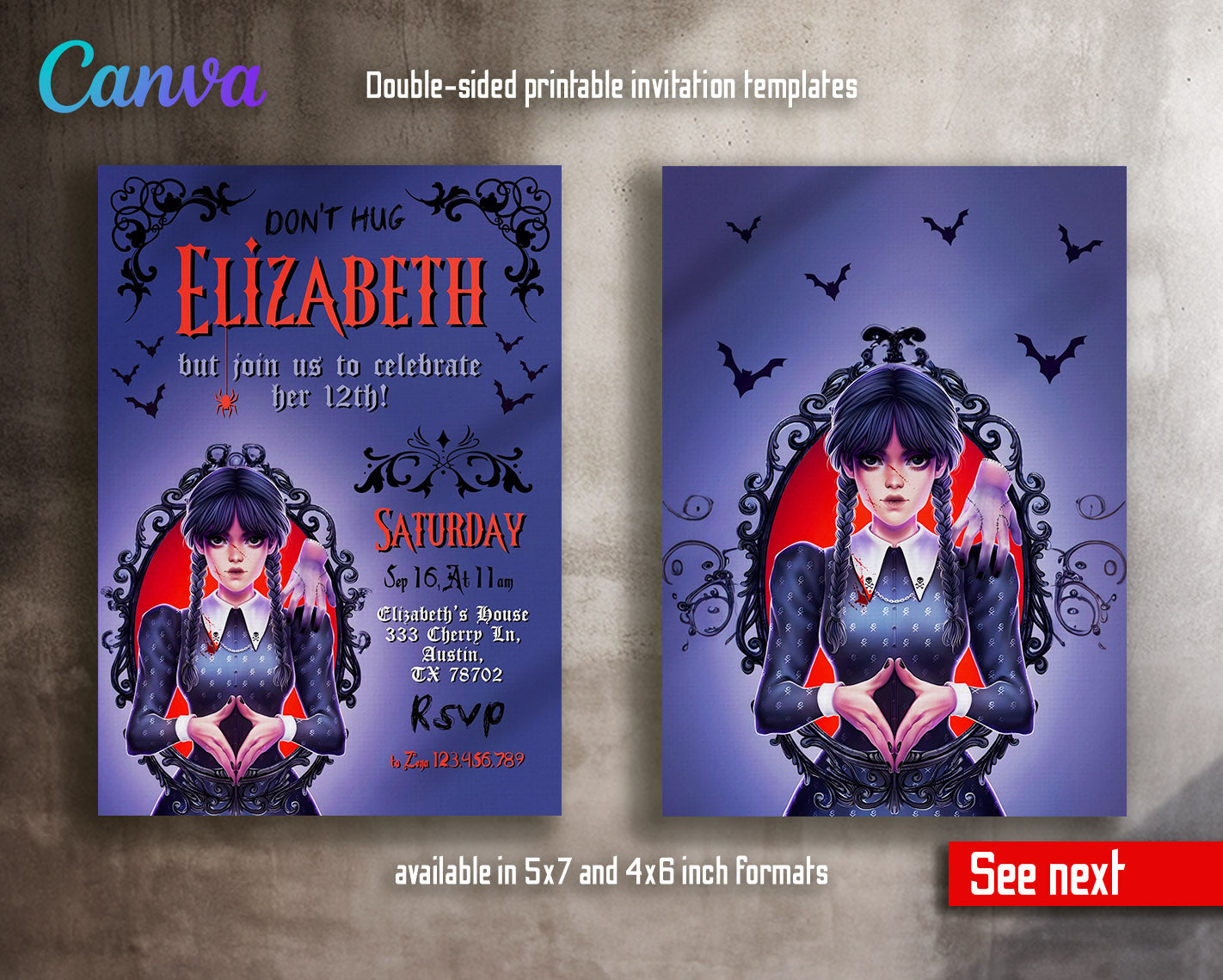 Related Tags: wednesday invite, wednesday birthday, addams family invite, addans invitation, wednesday party, digital invite, editable invitation, birthday invitation, printable invitation, invite template, scary witch, girl birthday,