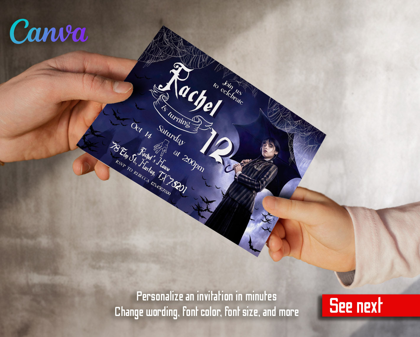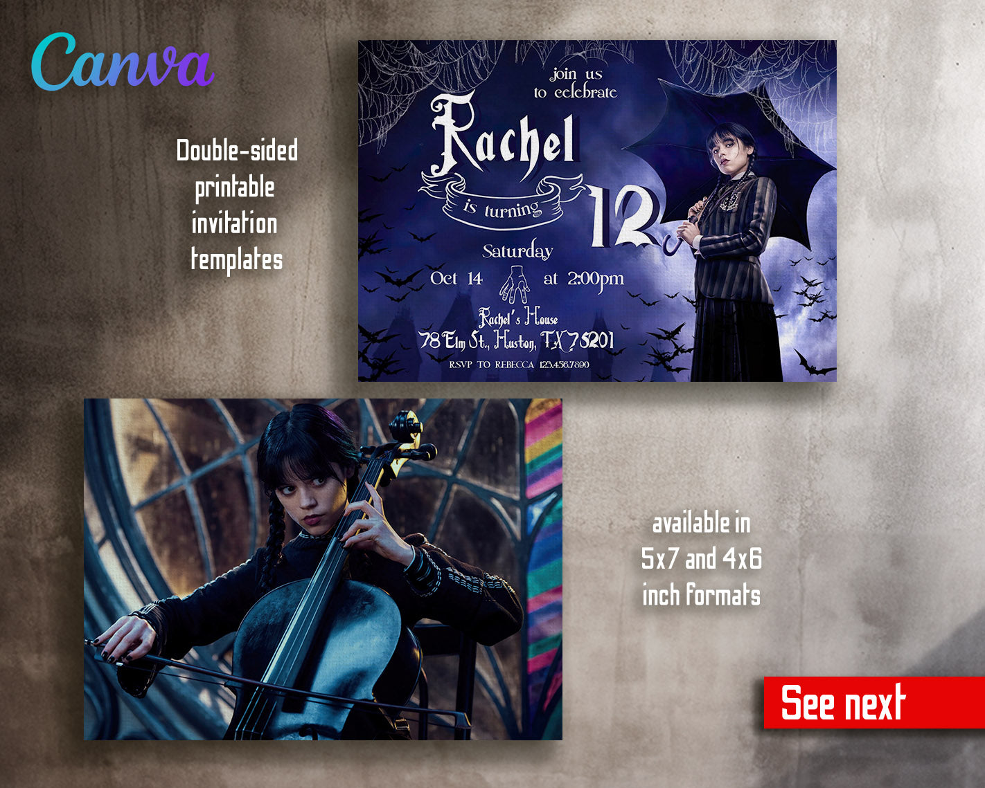 Related Tags: wednesday invite, wednesday birthday, addams family invite, addans invitation, wednesday party, digital invite, editable invitation, birthday invitation, printable invitation, invite template, scary witch, girl birthday,