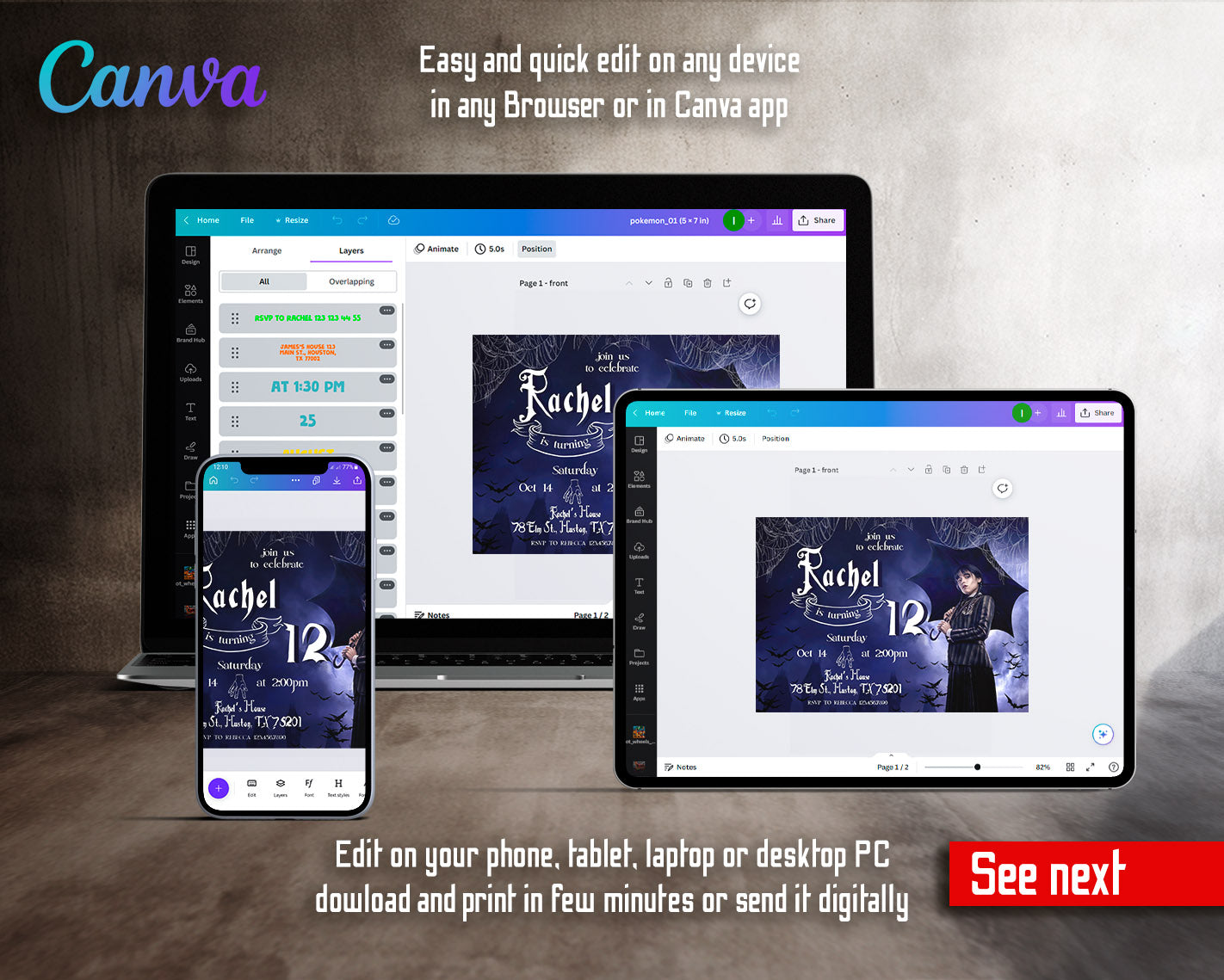 All the invitations are for self-editing. You will edit your template in Canva. It’s easy whether you're using the web browser or the app.