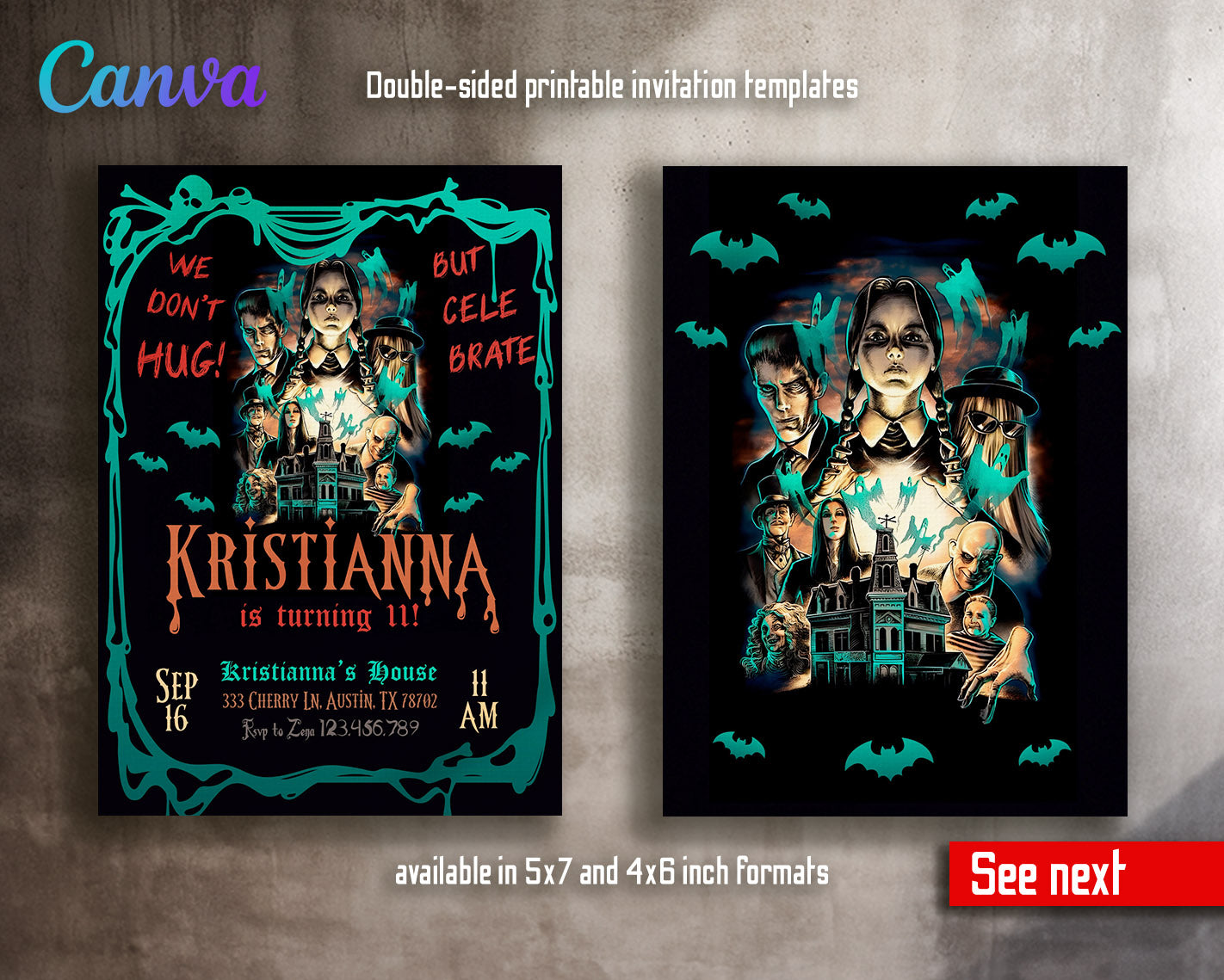 Related Tags: wednesday invite, wednesday birthday, addams family invite, addans invitation, wednesday party, digital invite, editable invitation, birthday invitation, printable invitation, invite template, scary witch, girl birthday,