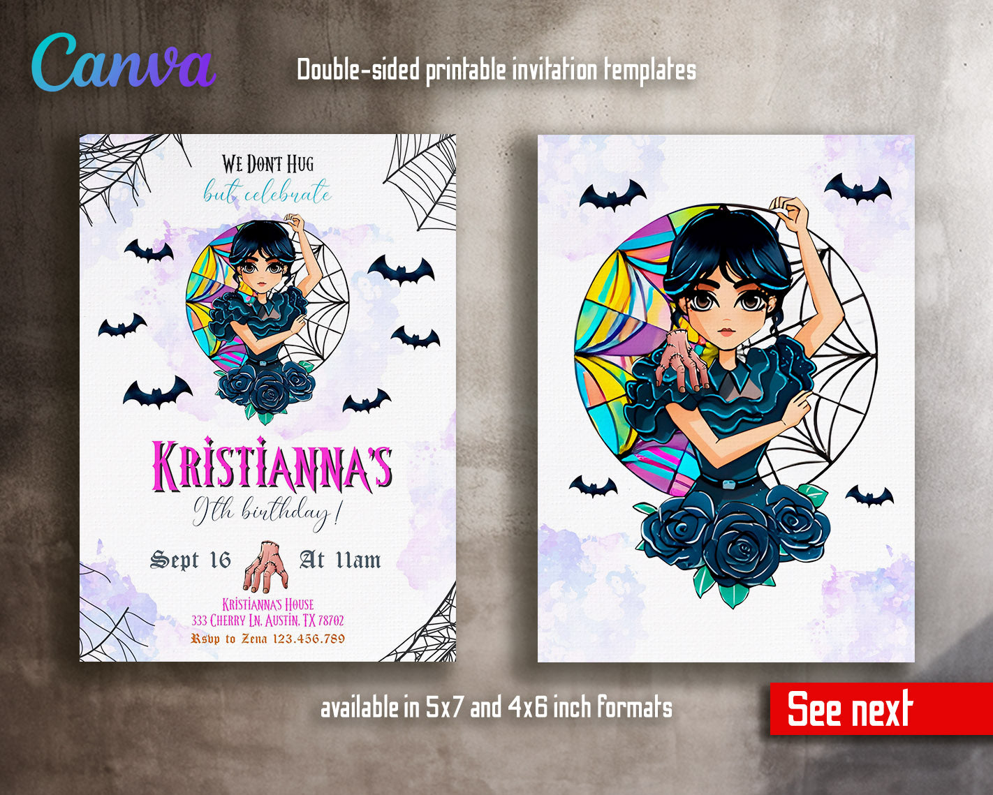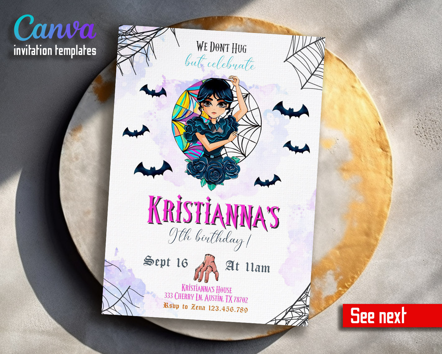 Related Tags: wednesday invite, wednesday birthday, addams family invite, addans invitation, wednesday party, digital invite, editable invitation, birthday invitation, printable invitation, invite template, scary witch, girl birthday,